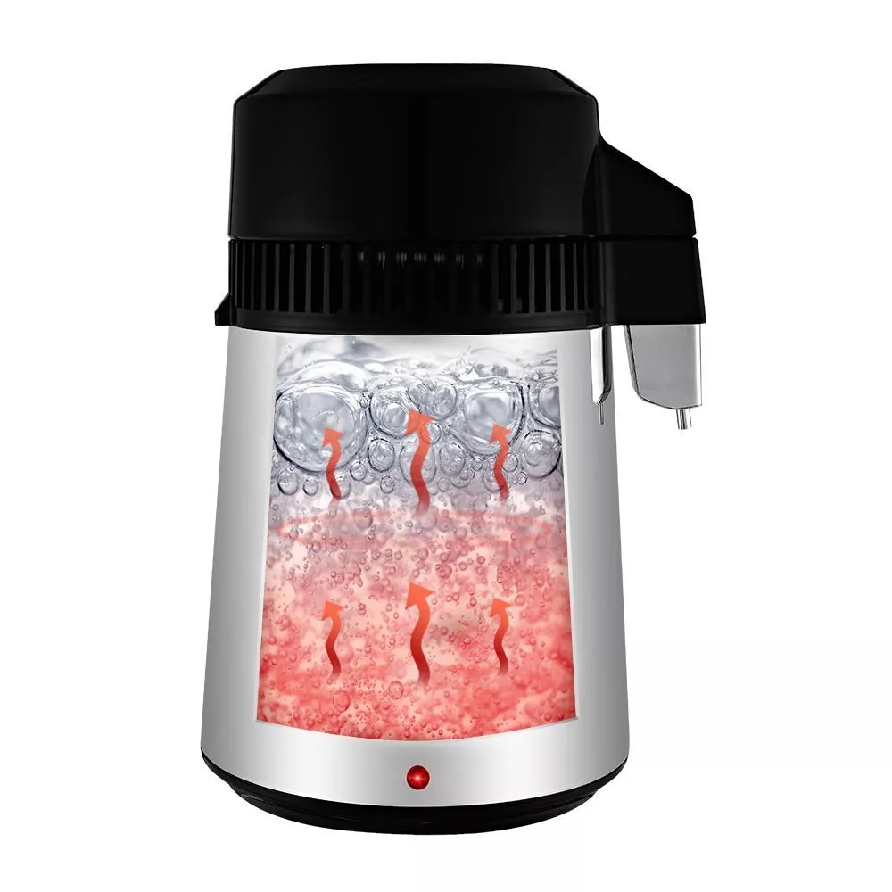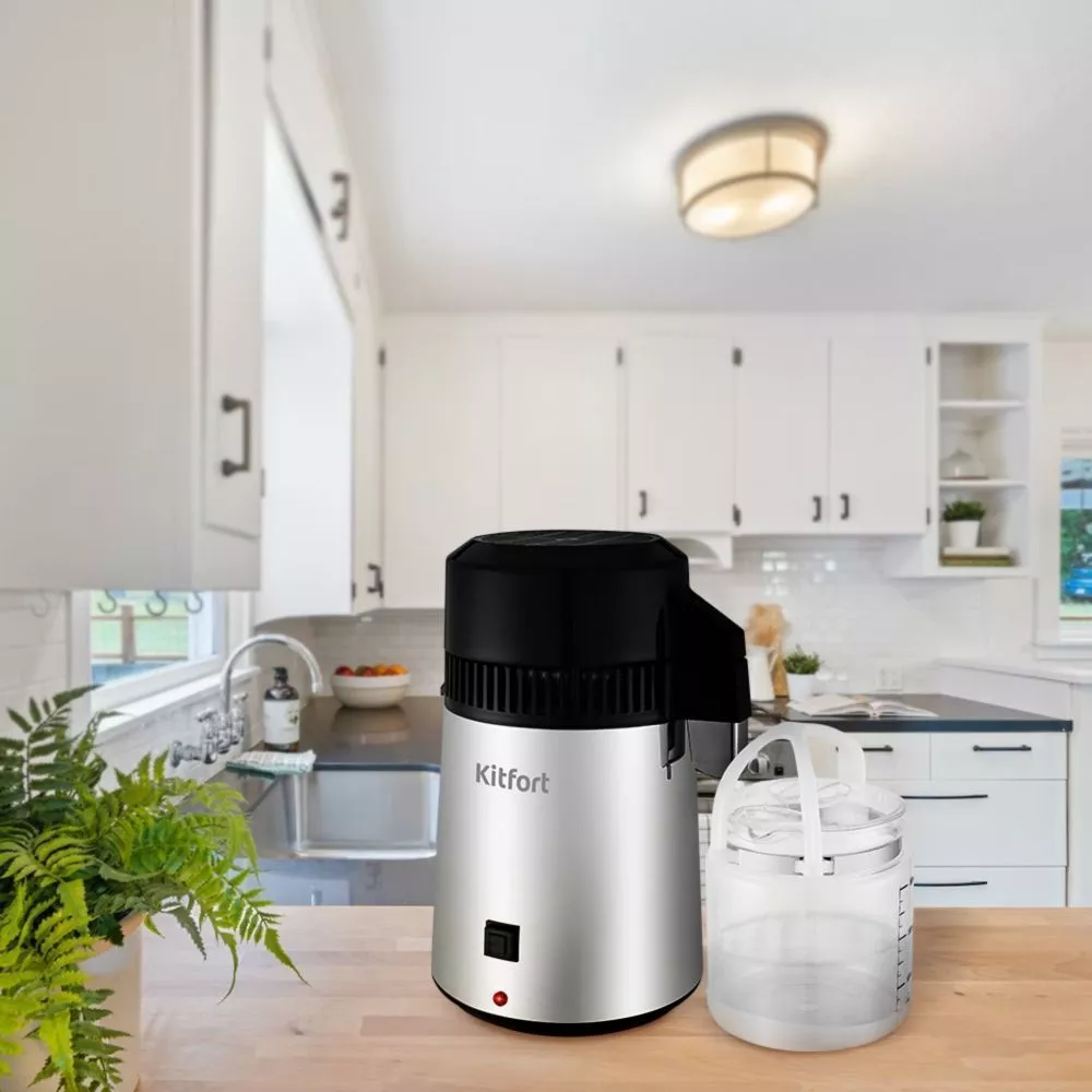 К дистиллятору в комплекте идёт стеклянная канистра с крышкой. Примерно через 4 часа дистиллятор перегонит всю воду в бойлере, сработает термостат, и дистиллятор отключится.