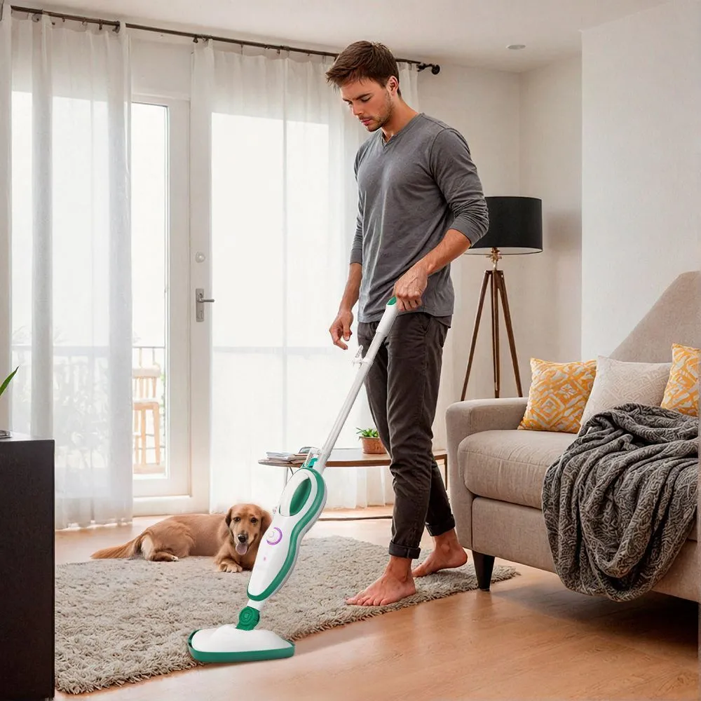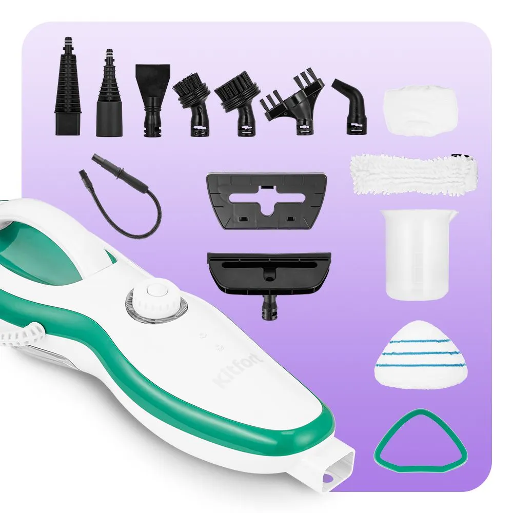 Скребок, нейлоновые щётки очищают стойкие загрязнения. Насадка для отпаривания со скребком используется для отпаривания вещей и чистки окон, зеркал. Также в комплекте идут струйная, угловая насадки, которые помогут очистить щели и углы. Тряпка для пола устанавливается на напольную щётку с помощью липучек. Её можно стирать в стиральной машине в тёплой воде. В комплекте есть рамка для ковра, которая обеспечивает лёгкое скольжение щётки во время чистки.