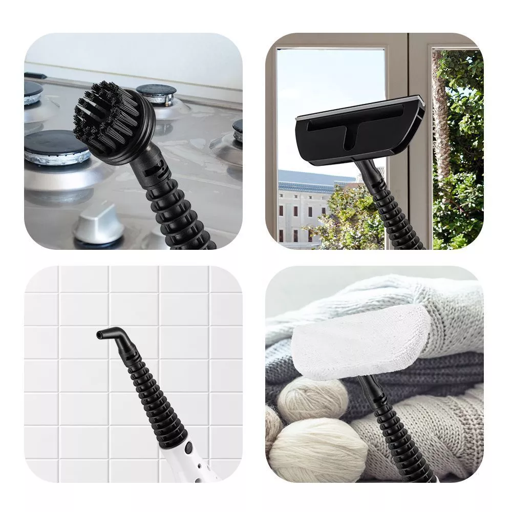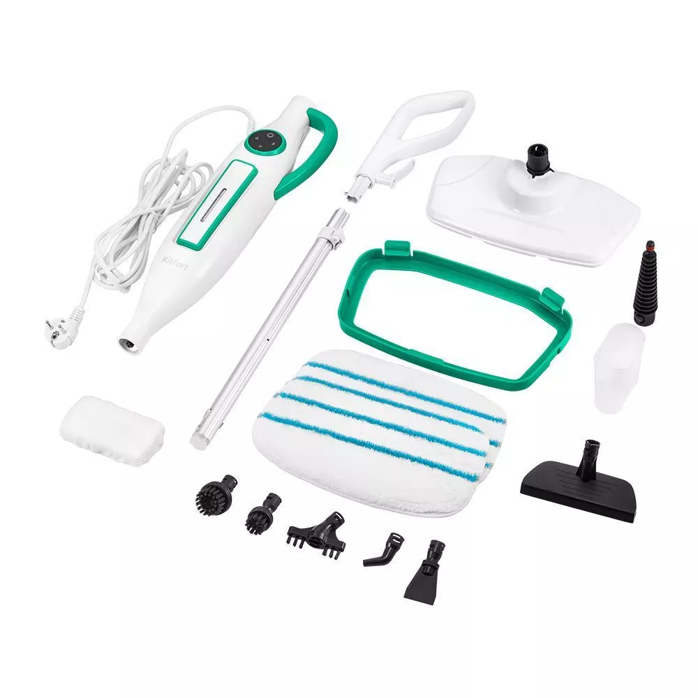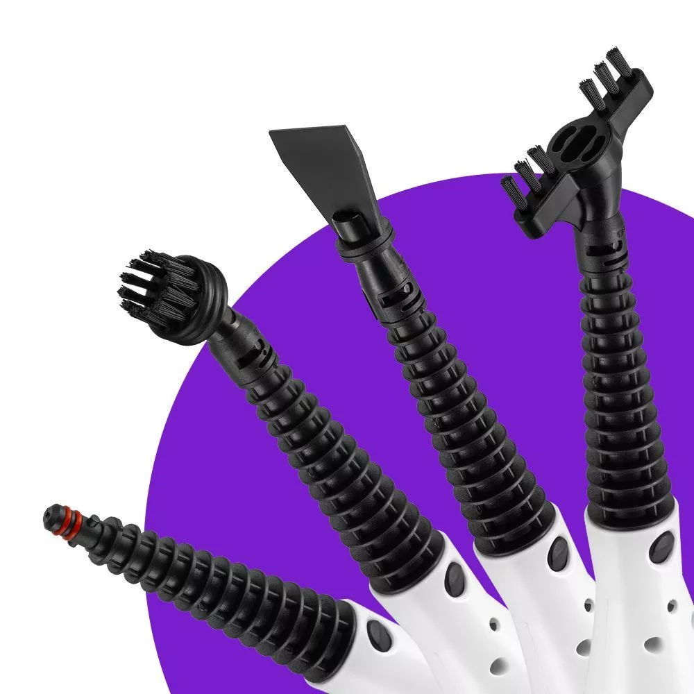 При помощи специальных насадок из комплекта КТ-1067 очистит напольные покрытия, раковину и плиту на кухне, зеркала, окна и плитку в ванной без каких-либо химических средств, исключительно паром. Плоская нейлоновая щётка удобна для уборки радиаторных батарей и решётчатых поверхностей, а струйная для чистки щелей и углов. Скребок подойдёт для очистки окон, зеркал и кафельной плитки. Латунная щётка поможет справиться со стойкими загрязнениями.