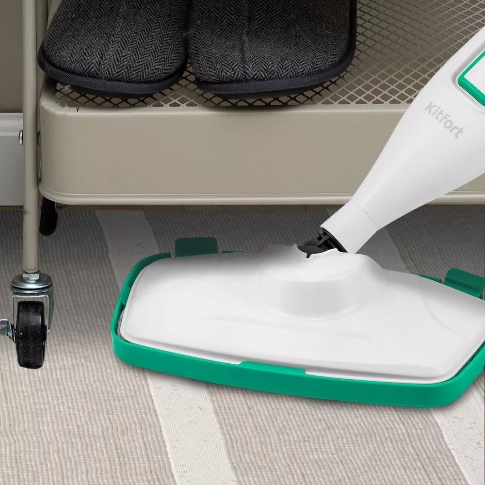 Паровая швабра КТ-1098 оснащена съёмным резервуаром для воды ёмкостью 330 мл, что позволяет производить непрерывную уборку в течение 15-18 минут в зависимости от уровня подачи пара.