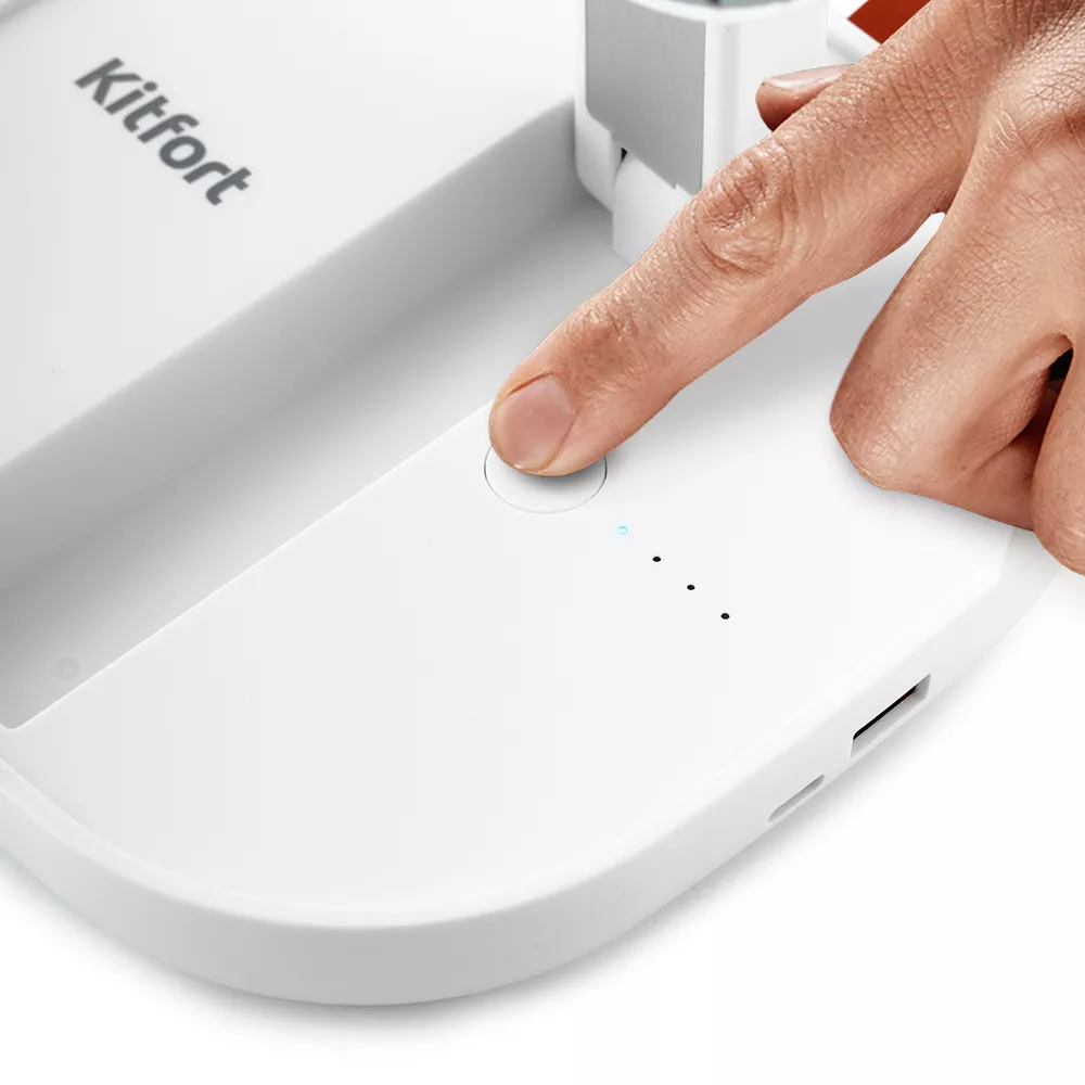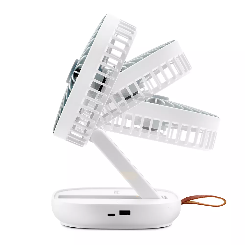 Вентилятор можно использовать как Power Bank. Он поможет вам, если у вас разрядился телефон, наушники или другое небольшое устройство. Сам прибор заряжается от USB. Зарядный шнур подсоединяется к Type-C разъёму, расположенному сбоку устройства. В комплекте с вентилятором идёт Type-C шнур для зарядки устройства.