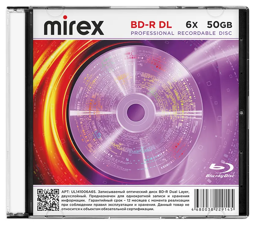 Blu-Ray диски Mirex произведены в соответствии с мировым стандартом и совместимы с любыми приводами, поддерживающими соответствующий формат чтения и записи. Поддерживает скорость передачи данных 6X, что соответствует 216 Мбит/с. Время записи составляет 30 минут. Емкость 50 Гб позволяет вместить информации в 10 раз больше, чем на стандартный DVD-диск объемом 4,7 Гб.
