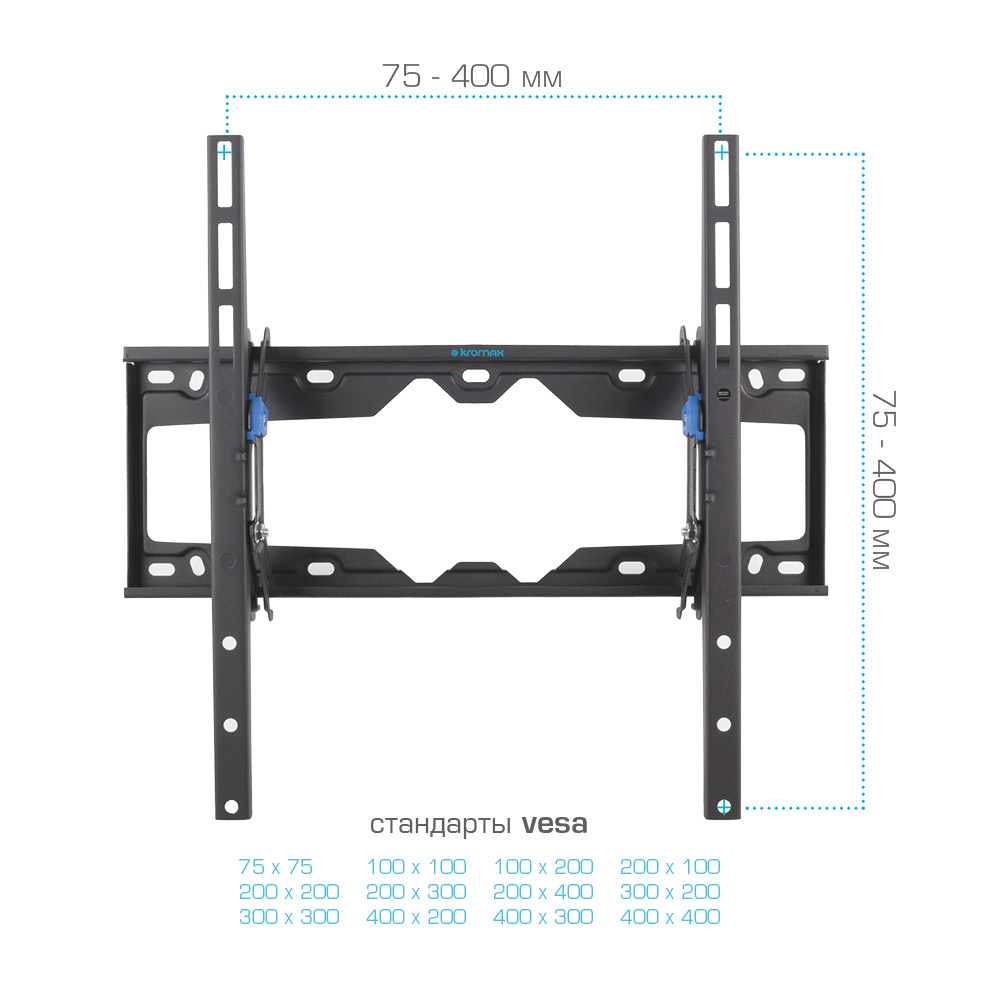 Кронштейн подходит для большинства телевизоров популярных брендов, таких как Samsung, LG, Sony, Panasonic, Sharp, Toshiba, KIVI, Xiaomi Mi, SUPRA, Hyundai, Erisson, Horizont, JVC, Thomson, HAIER, BBK, Витязь, Веко, BQ, OZON, SkyLine, Pioneer, Philips, Rolsen, Harper, Hisense, Hitachi, Polarline, Prestigio и других. Крепёжные отверстия Kromax ELEMENT-4 изготовлены по стандарту VESA.