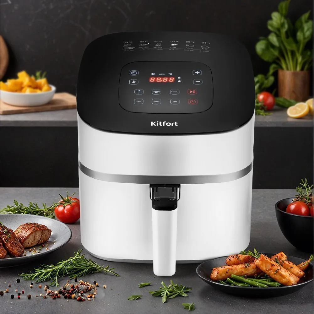 Аэрогриль КТ-2217 имеет оригинальную форму и лаконичный дизайн. Благодаря форме корпуса он отлично впишется в вашу кухню и не займёт много места.
