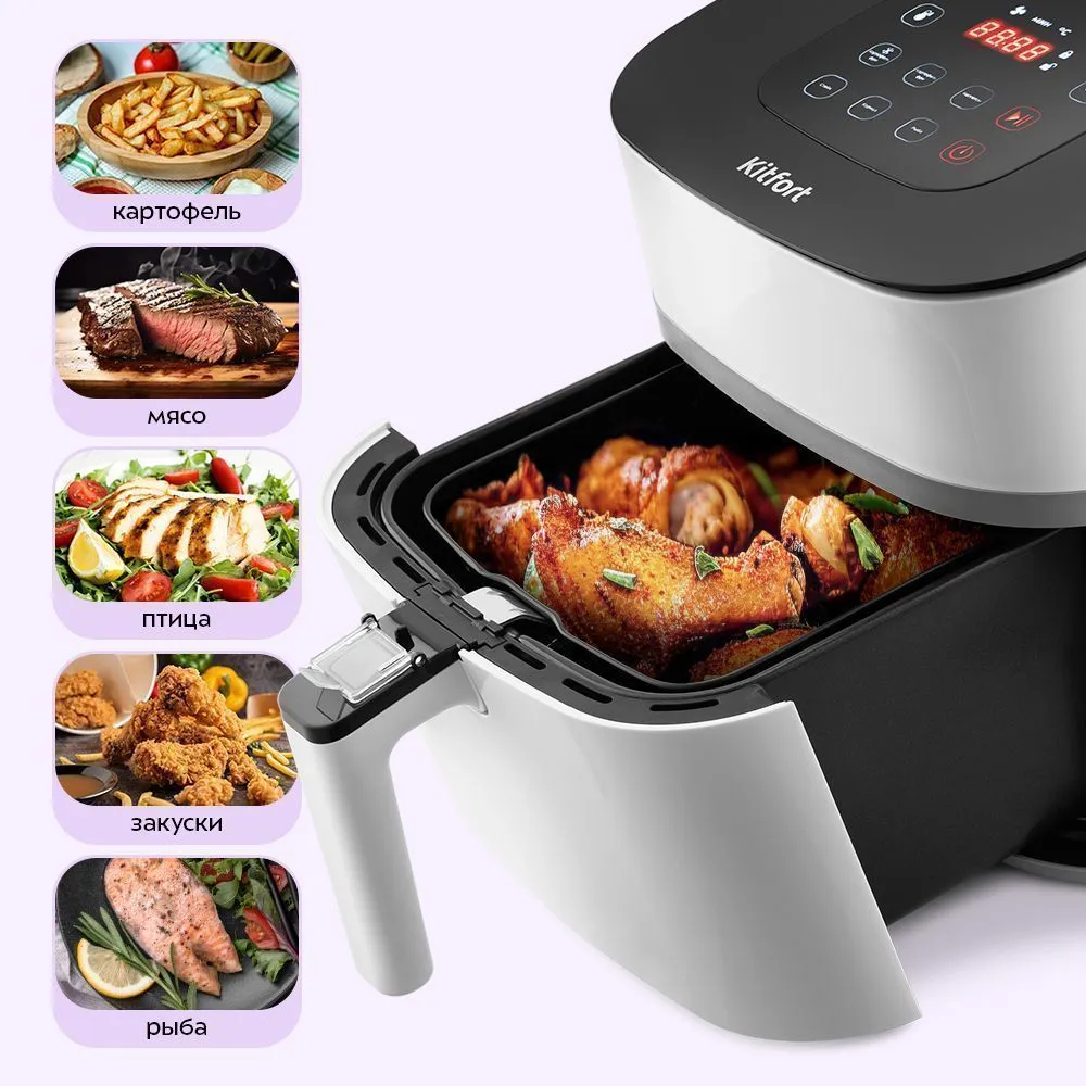 Аэрогриль КТ-2217 станет достойной заменой духовки, грилю, фритюрнице и микроволновке, что отлично поможет сэкономить вам место на кухне. Мощность прибора составляет 1500 Вт. Благодаря системе циркуляции горячего воздуха, продукты обжариваются равномерно со всех сторон, получаясь при этом нежными внутри и с хрустящей корочкой снаружи.