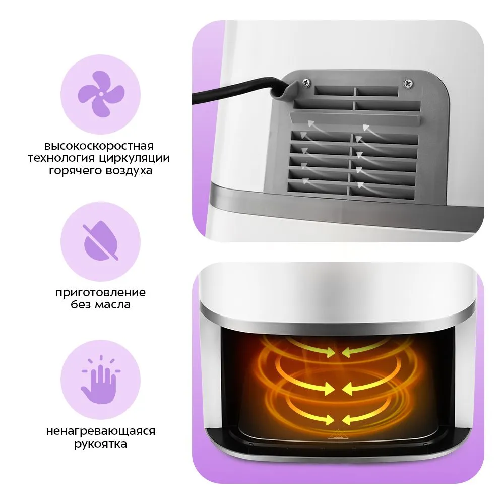 Аэрогриль оснащён электронным управлением, он имеет 6 автоматических программ. На дисплее отображаются температура и время приготовления.