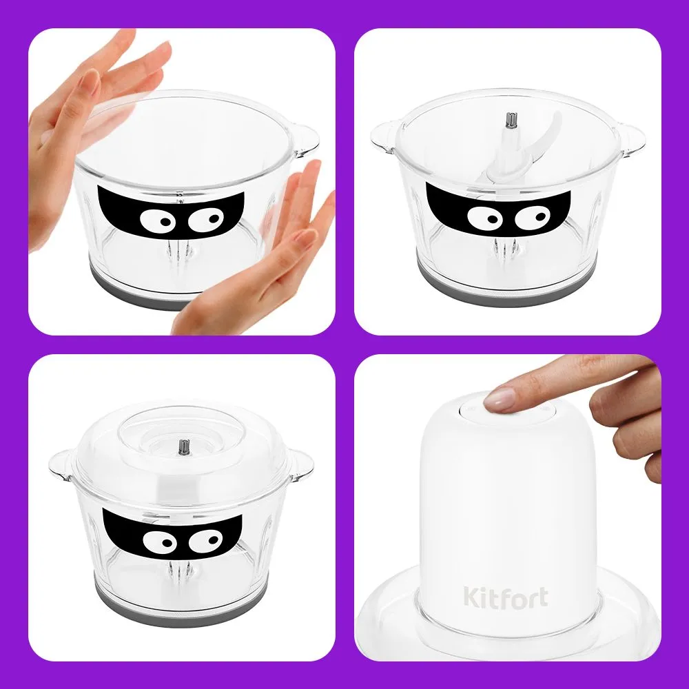 Конструкция измельчителя полностью разборная. Чаша стеклянная, её можно закрыть крышкой и использовать для хранения продуктов. В комплекте идёт лопатка, чтобы тщательно счищать стенки чаши.