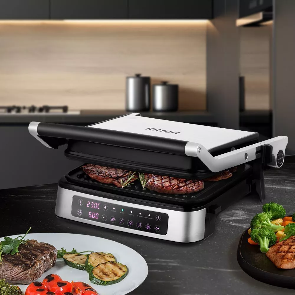 С помощью панели управления вы можете выбрать автоматический режим работы: мясо, рыба, курица, сосиски, гамбургер и бекон. Вы также можете вручную установить температуру нагрева до 230°C. Кроме того, прибор обладает настройкой степени прожарки.