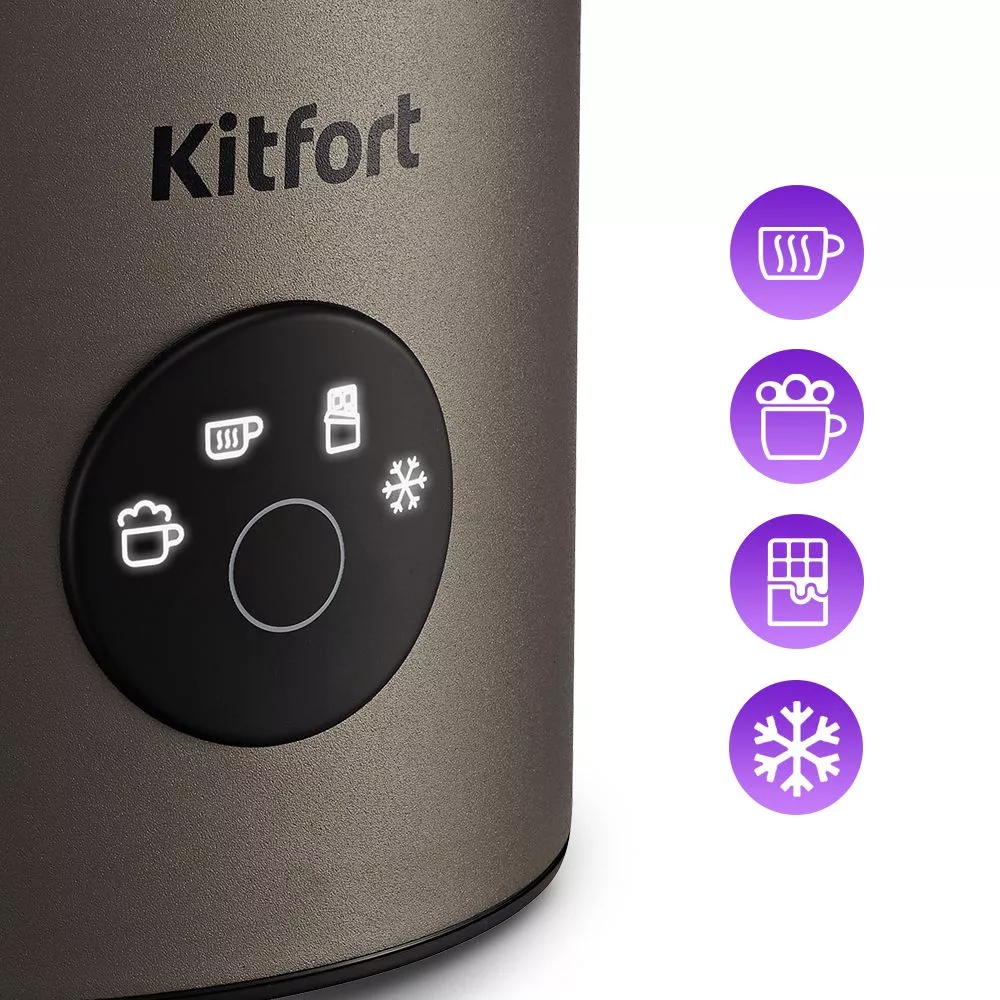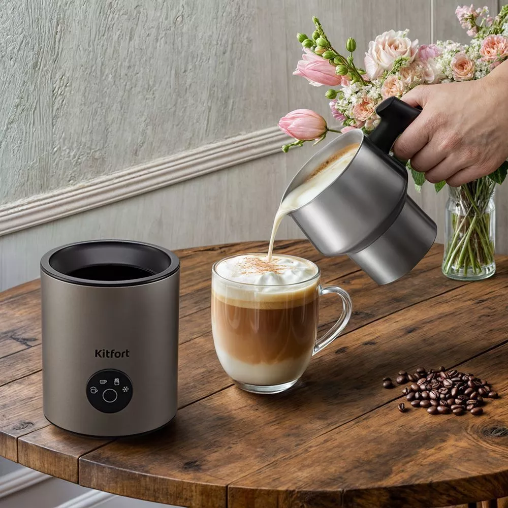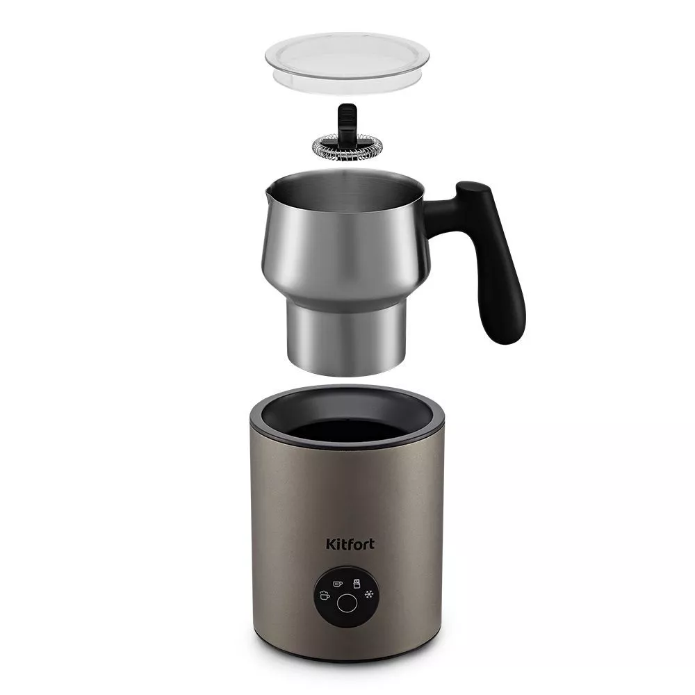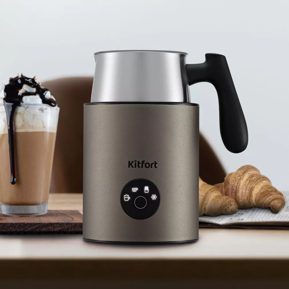 Капучинатор Kitfort КТ-7273 порадует вас не только пышной молочной пенкой, но и своим стильным дизайном. Устройство компактное, ручка питчера пластиковая, не нагревается и удобно лежит в руке.