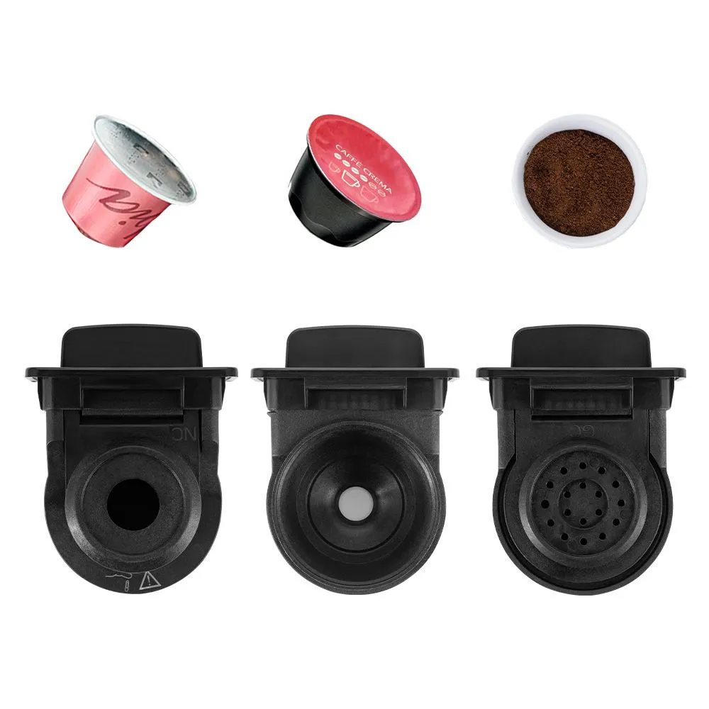 Благодаря 3 адаптерам, которые входят в комплект, кофеварка подходит для капсул типа Nespresso и Dolce Gusto, а также для молотого кофе. Она прекрасно совмещает в себе все преимущества каждого типа кофеварок и готовит под давлением 19 бар.
