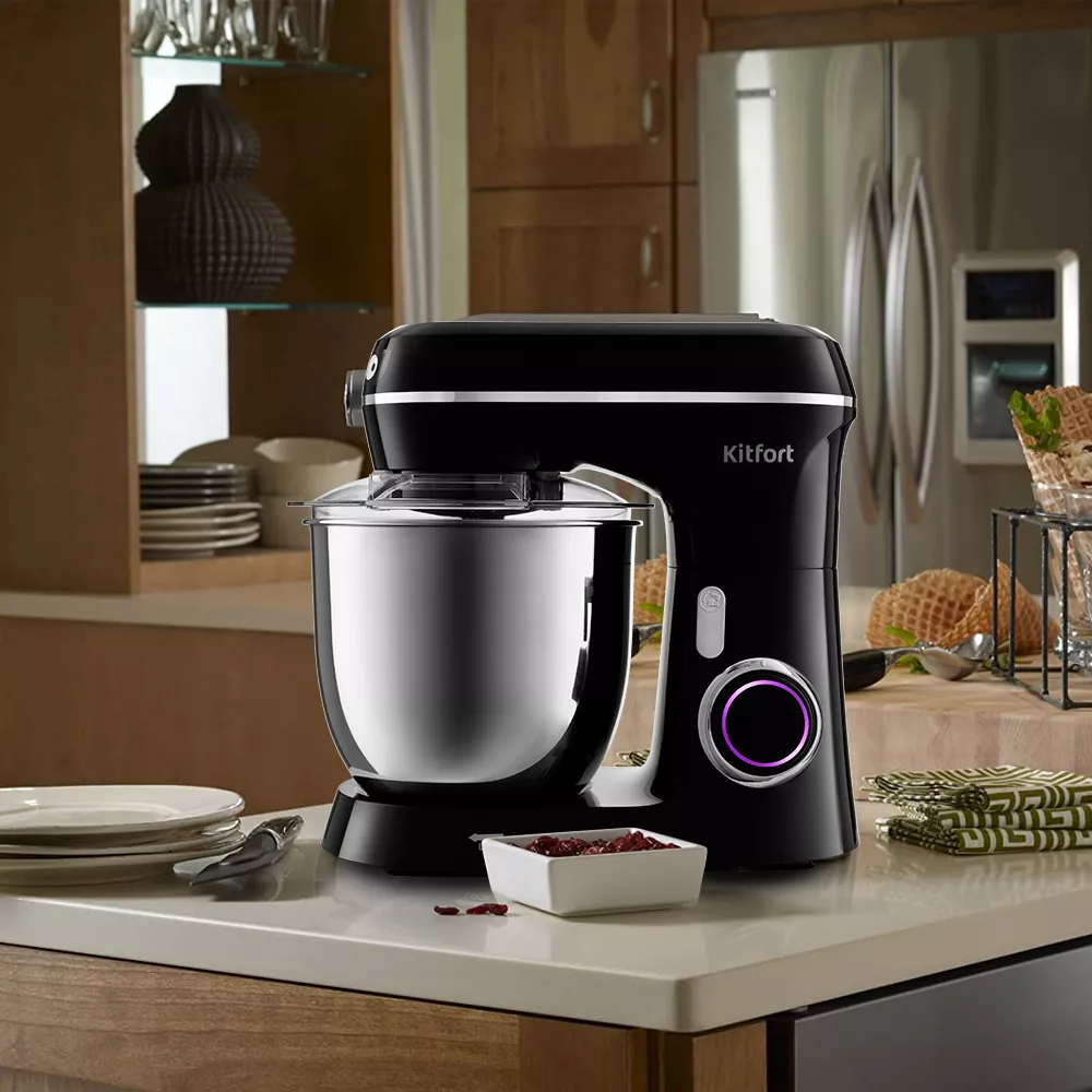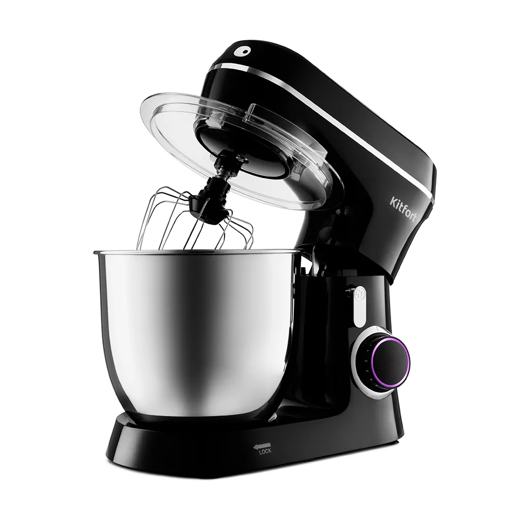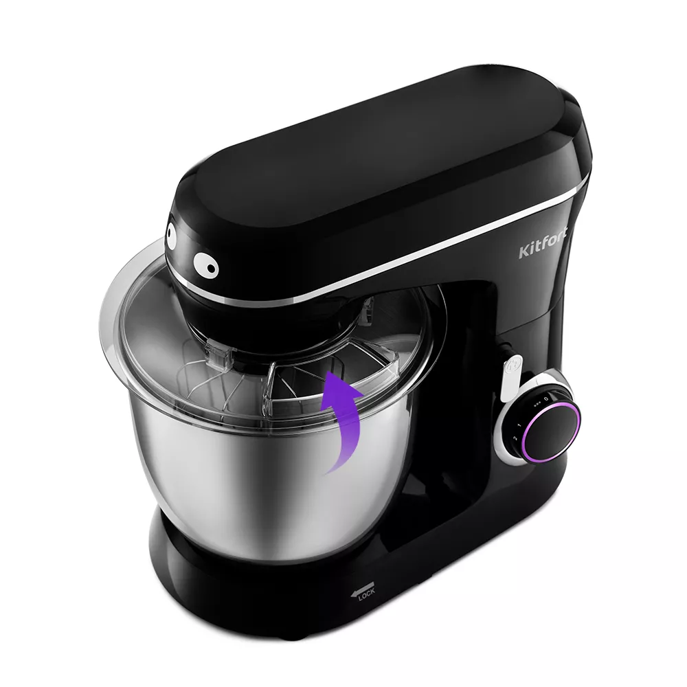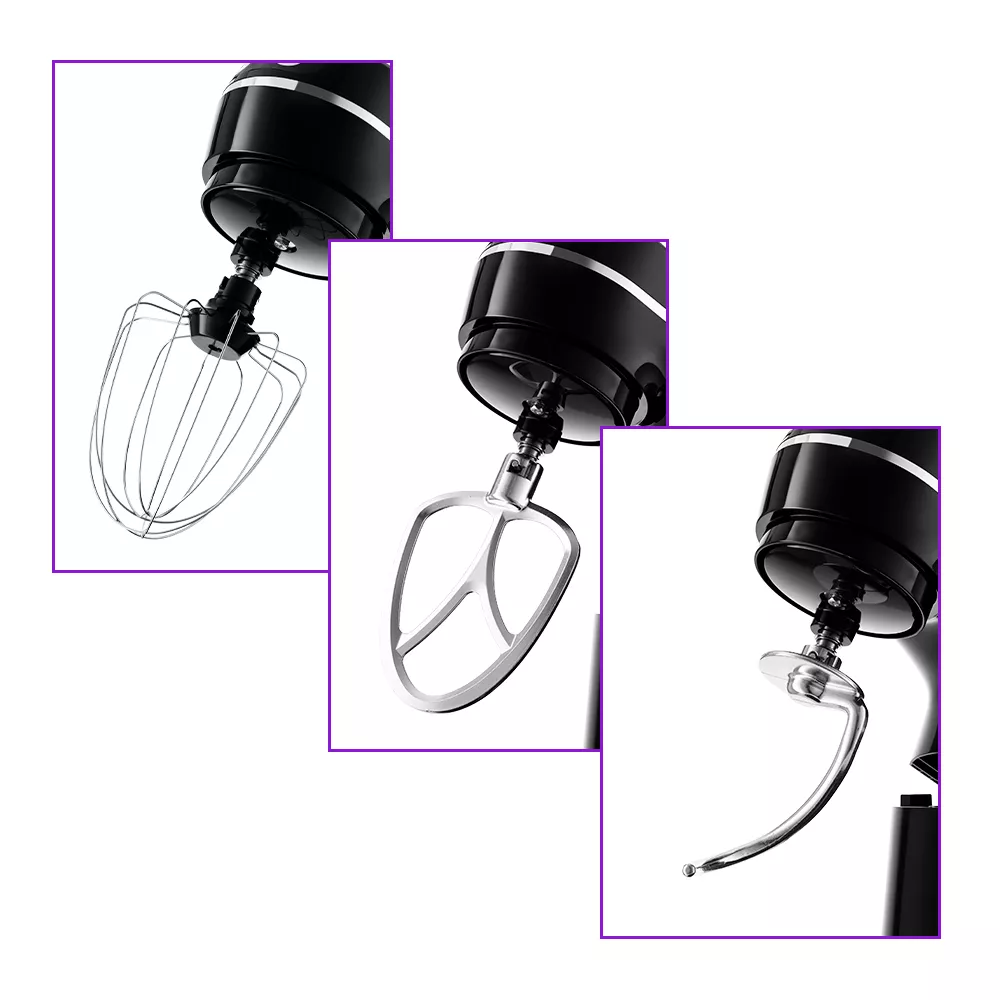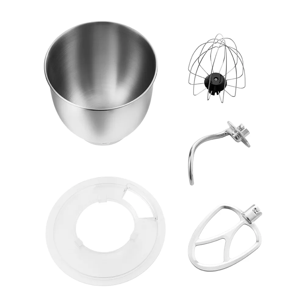 В комплекте идут венчик для взбивания, крюк для замеса крутого теста, насадка для смешивания и приготовления пюре. Форма насадок и чаши подобраны так, что почти при любом количестве продуктов насадка качественно их перемешает. Все комплектующие легко снимаются и очищаются.