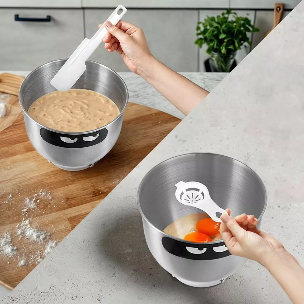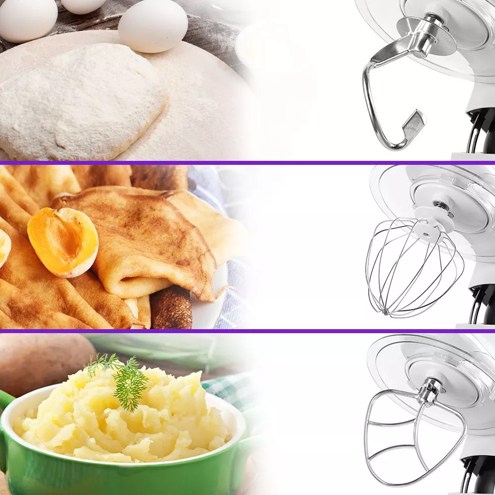 В комплекте к миксеру идут три насадки. Крюк для замешивания подойдёт для замешивания густого теста. Венчик служит для взбивания яичных белков, сливок, замешивания жидкого теста. Насадка для смешивания используется для негустых ингредиентов. Дополнительно прилагается лопатка для перемешивания ингредиентов и сепаратор для яиц. Благодаря приборам процесс приготовления пищи станет ещё более комфортным и приятным.