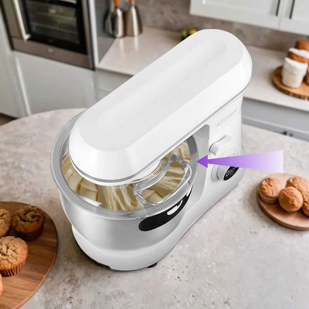Миксер оснащён большой чашей ёмкостью 7 литров. Она прочная, изготовлена из нержавеющей стали, и в ней можно смешивать даже горячие ингредиенты. А крышка предотвращает разбрызгивание и позволяет добавлять ингредиенты прямо во время работы.