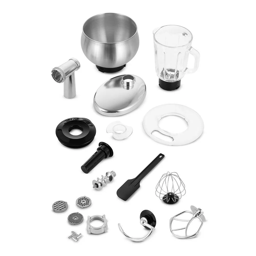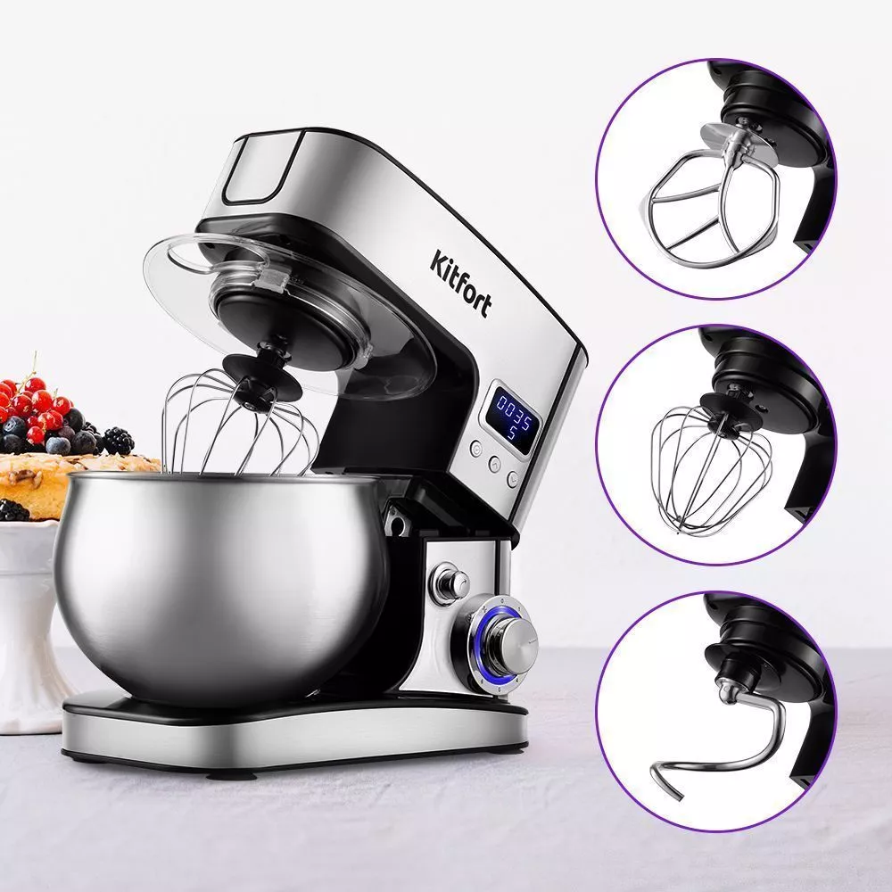 В комплекте с миксером идут венчик для взбивания, крюк для замеса крутого теста, насадка для смешивания и приготовления пюре. Форма насадок и чаши подобраны так, что почти при любом количестве продуктов насадка качественно их перемешает.