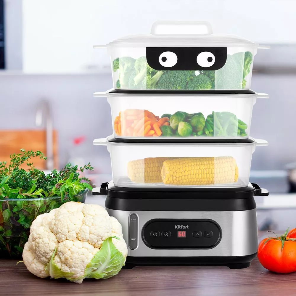 КТ-4082 оснащена тремя паровыми корзинами ёмкостью 3 литра, что позволит приготовить обед из нескольких блюд сразу на всю семью. В специальной чаше для риса вы сможете готовить каши, супы, пудинги и йогурты.