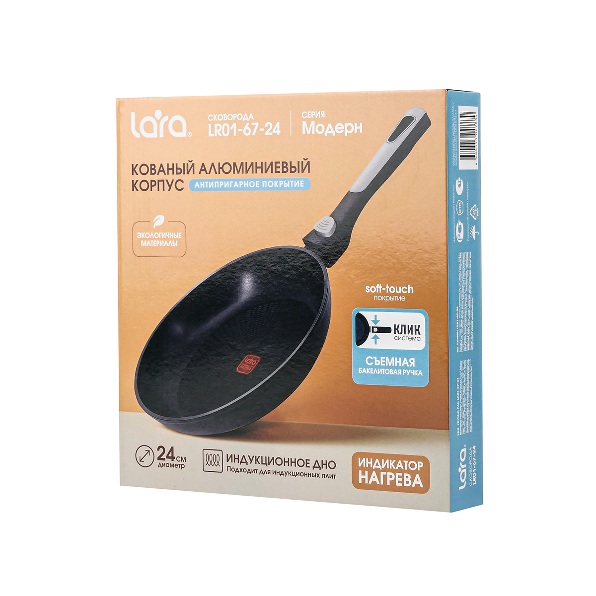 Сковорода выполнена из экологичных материалов, имеет износостойкое антипригарное покрытие. Ручки выполнены из бакелита и имеют покрытие SOFT TOUCH, легко снимаются для удобного хранения.