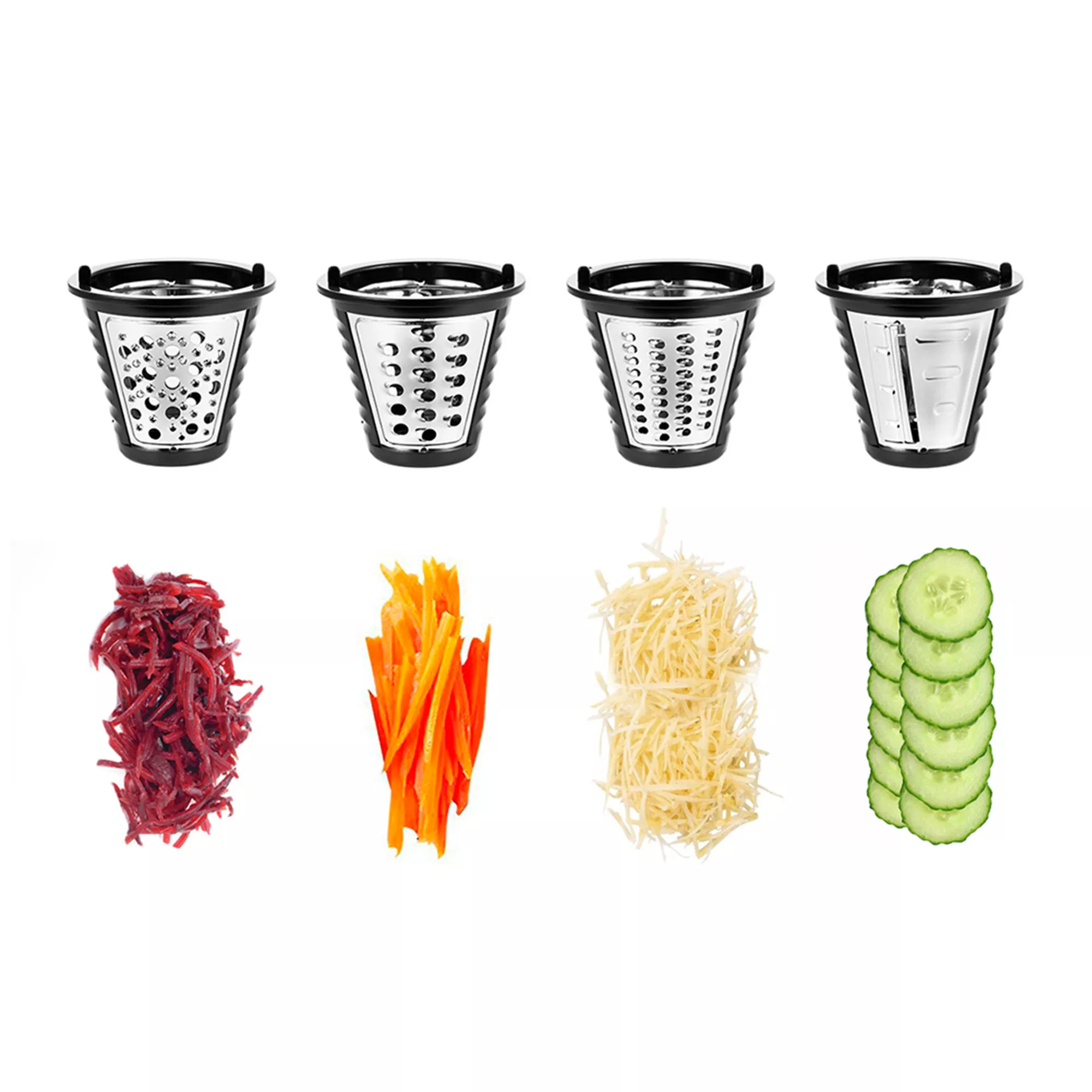Прибор предназначен для тёрки и шинковки овощей, фруктов и других пищевых продуктов в домашних условиях. В комплекте есть 3 тёрочных ножа и 1 шинковочный нож.