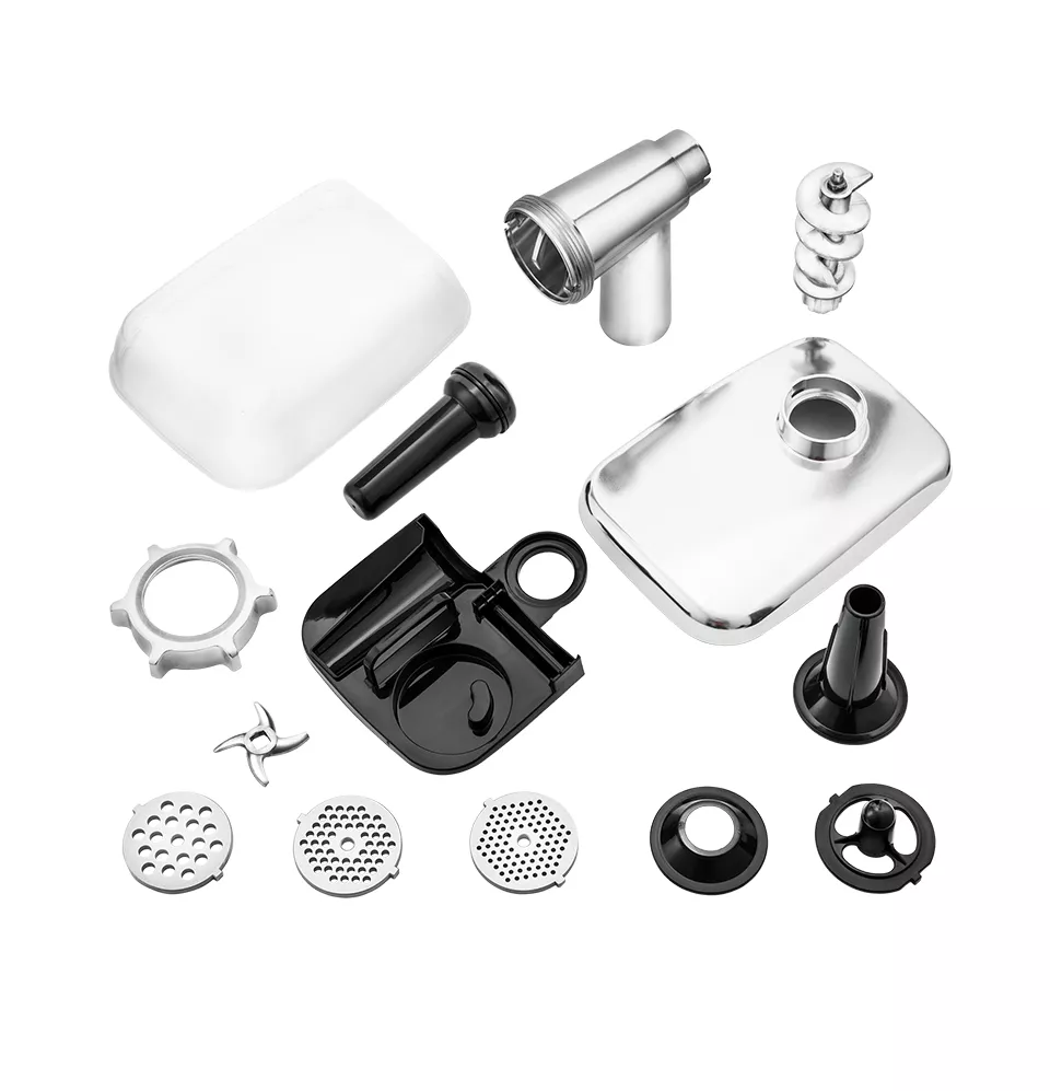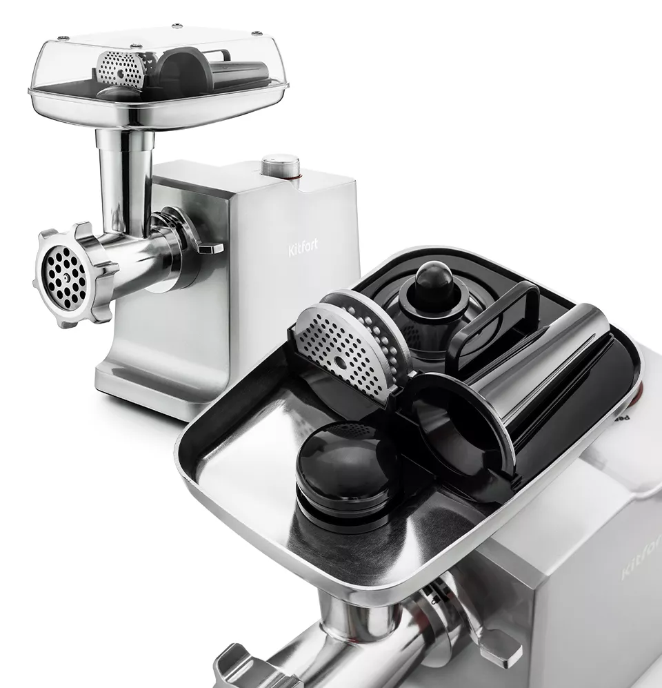 В комплект входят решётки для фарша различного диаметра, которые позволят сделать как котлеты и бифштексы, так и нежнейшие фрикадельки, например, для детского питания. Насадки для колбас и кеббе используются для приготовления колбасок.