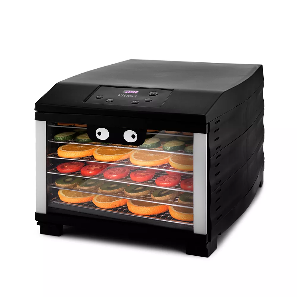 Сушилка оборудована большим мощным вентилятором, что обеспечивает равномерный горизонтальный обдув всех 6 поддонов. Поток воздуха направлен горизонтально, поэтому запахи продуктов с разных поддонов не смешиваются.