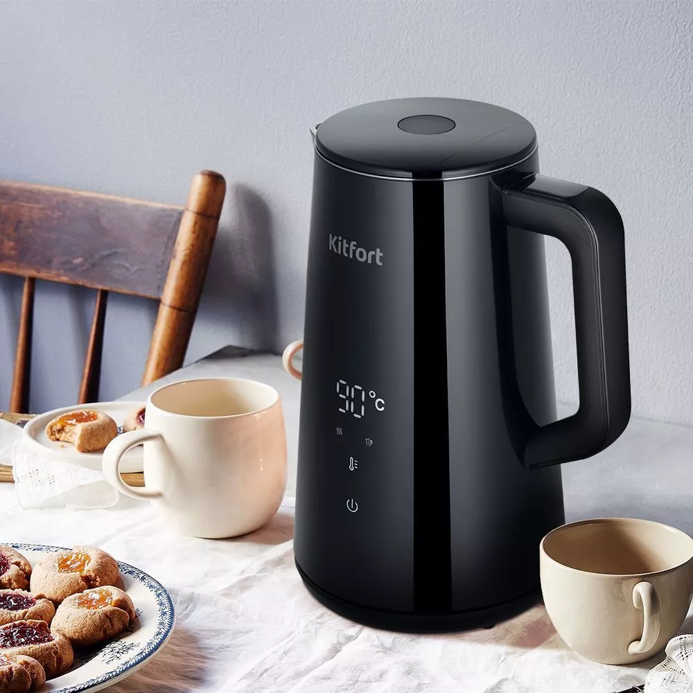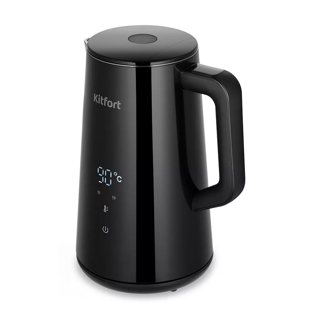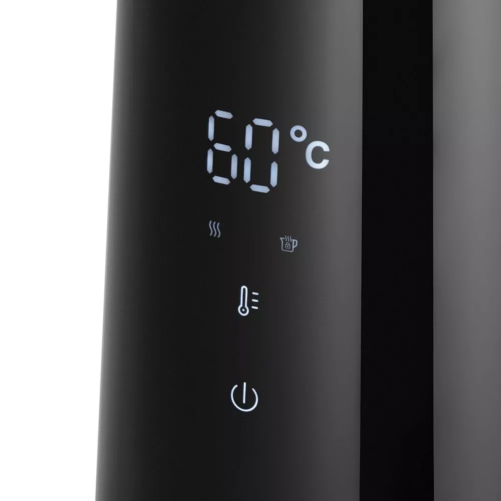 На корпусе расположена панель управления и LED-дисплей. Чайник KT-6186 может не только вскипятить воду, но и нагреть ее до температур: 40, 60, 85 и 90 °С для различных сортов чая. А температура 40 °С удобна для приготовления детского питания.