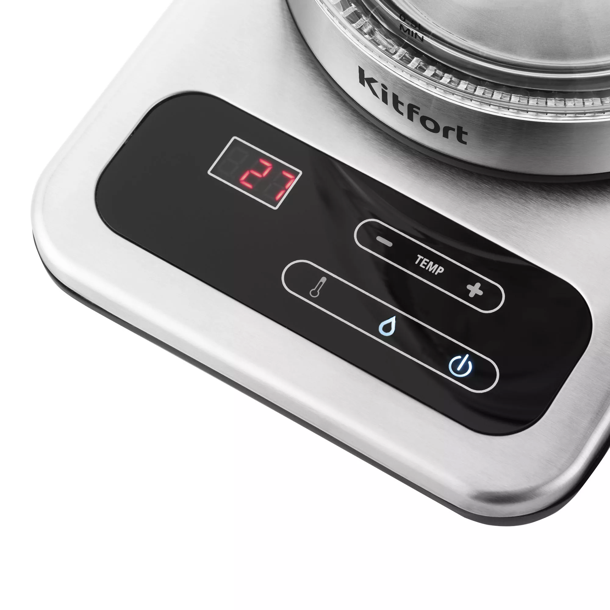 Корпус и крышка чайника выполнены из стекла, а ручка и подставка — из сочетания пластмассы и нержавеющей стали.