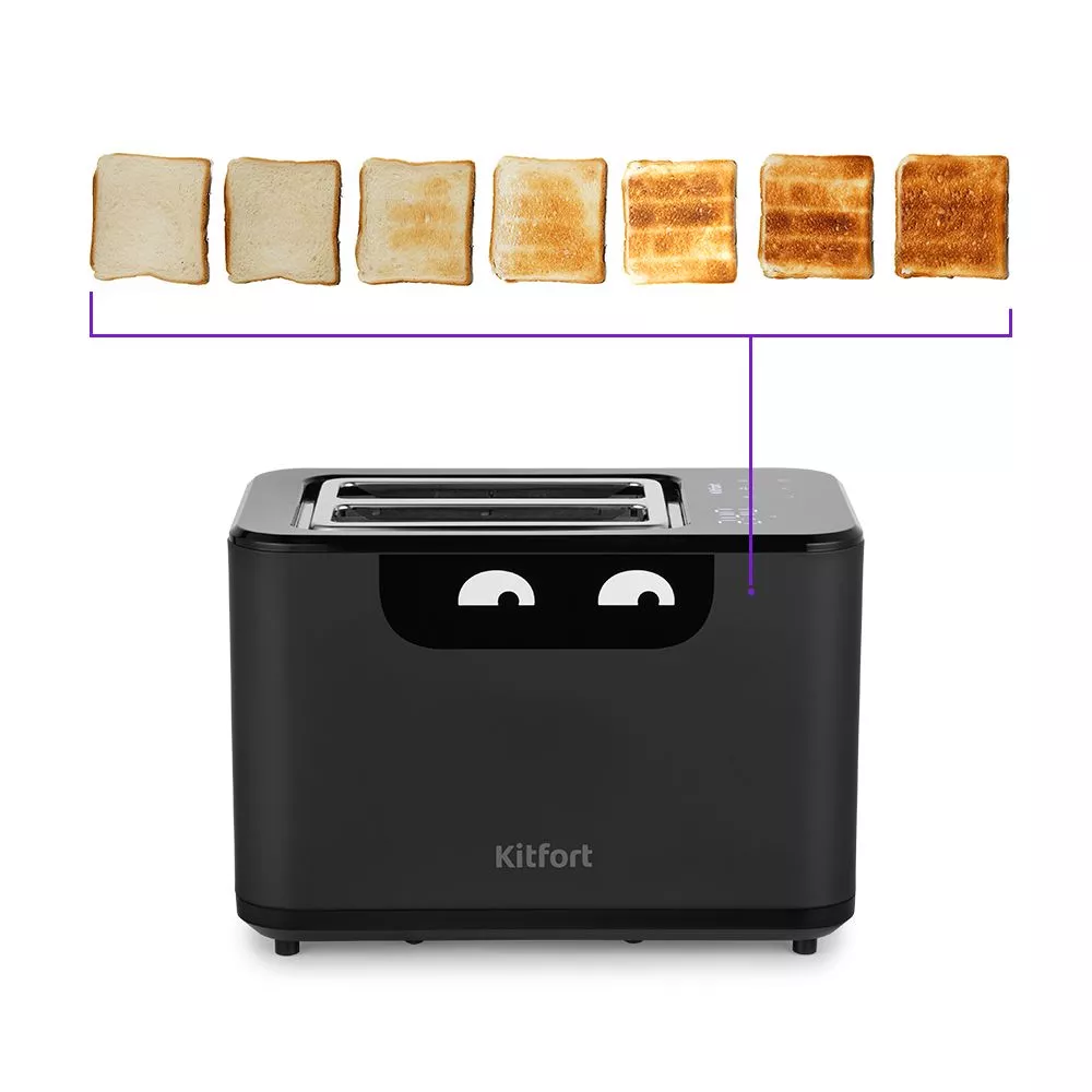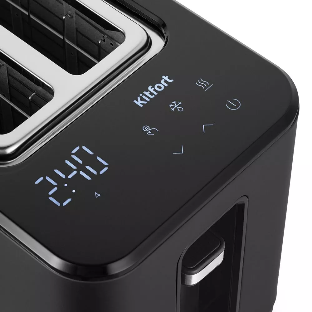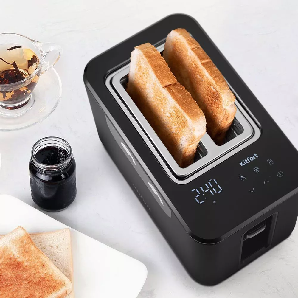 Тостер оснащён панелью управления с LED-дисплеем и сенсорными кнопками, где можно выбрать режимы работы: подогрев, разморозка, предустановленный режим и выбор степени обжаривания.