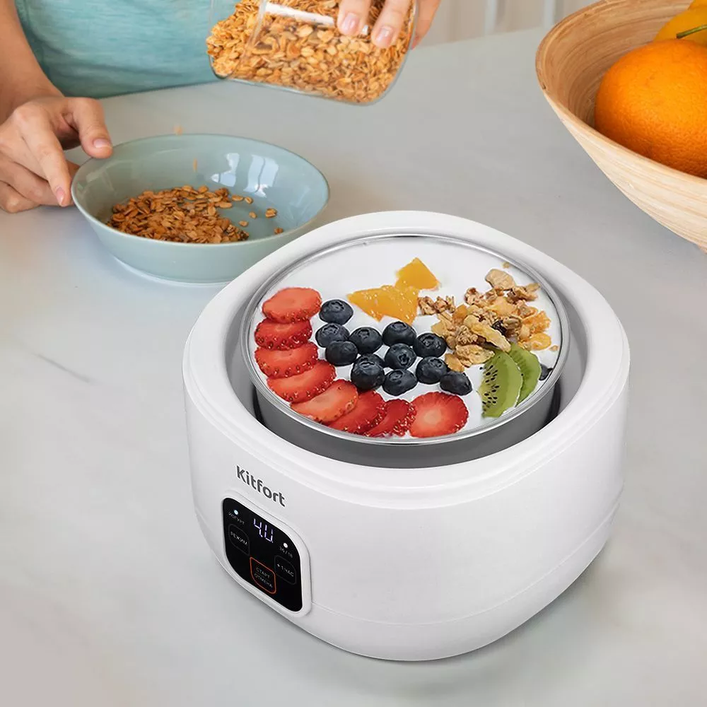 Готовить йогурт с КТ-6082 очень легко. Просто смешайте молоко и закваску в чаше, далее установите чашу в йогуртницу. Выберите режим приготовления, установите время и нажмите кнопку старта. Спустя 8 часов натуральный, полезный продукт будет готов! Йогуртница равномерно нагревает чашу с ингредиентами, поддерживая заданную температуру. Прибор укомплектован чашей из нержавеющей стали на 1 литр с пластиковой крышкой. Готовый йогурт можно хранить в холодильнике прямо в чаше.