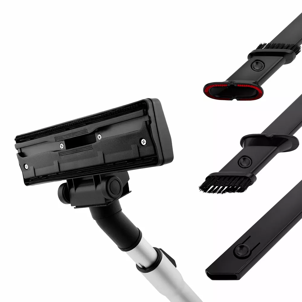 В комплекте с пылесосом идёт телескопическая ручка и удобная напольная щётка, которая используется для чистки ковровых покрытий и удаления шерсти животных, а также узкая насадка «3 в 1» с длинным и коротким ворсом для чистки неровных и рифлёных поверхностей, углов, плинтусов.