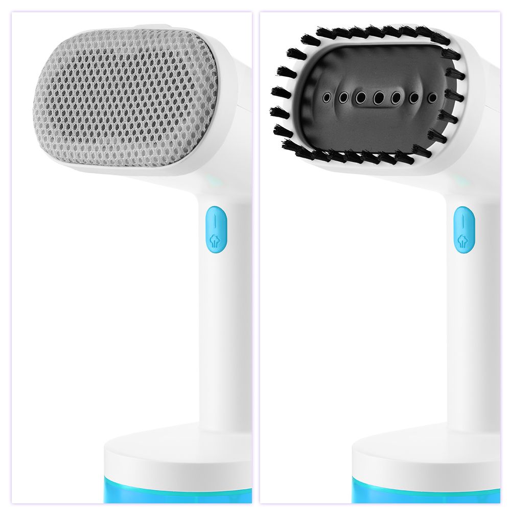 В комплекте с ручным отпаривателем идут 2 насадки. Ворсовая легко чистит загрязнённые поверхности, а также убирает шерсть домашних животных, волосы, ворс. Тканевая насадка необходима при работе с деликатными тканями.