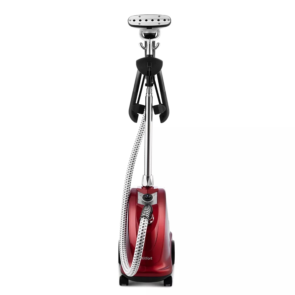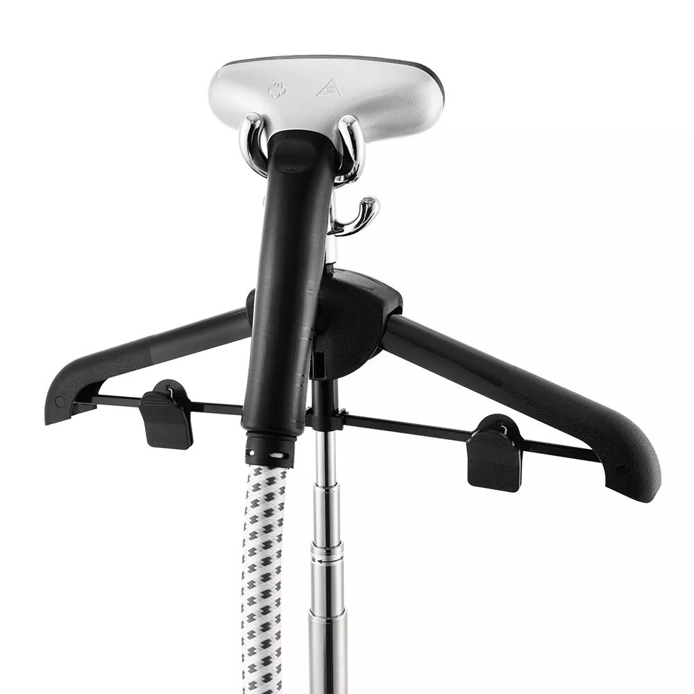 Вешалка и телескопическая стойка складные, а корпус отпаривателя компактный. Такая конструкция позволяет удобно хранить его в комнате или в шкафу. Корпус прибора оснащён колесиками для удобного перемещения по квартире.Та