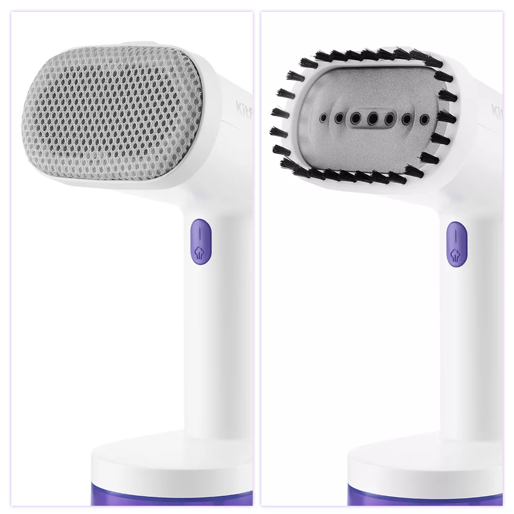 В комплекте с ручным отпаривателем идут 2 насадки. Ворсовая легко чистит загрязнённые поверхности, а также убирает шерсть домашних животных, волосы, ворс. Тканевая насадка необходима при работе с деликатными тканями.
