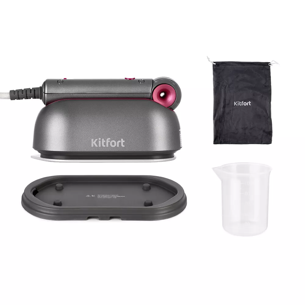 В комплекте с отпаривателем идут мерный стаканчик для залива воды, тканевый мешочек для хранения и подставка для остывания прибора. После использования отпаривателя, его удобно оставить на подставке для безопасного остывания рабочей поверхности.