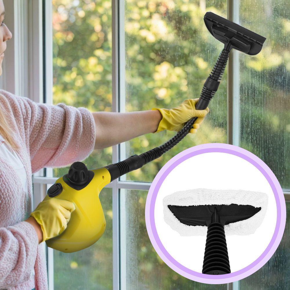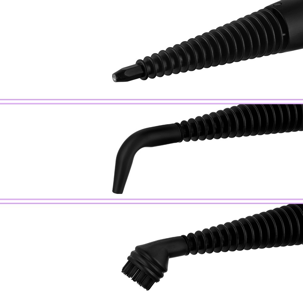 Сопло струйной насадки создаёт мощную струю пара, способную напором выбить грязь из щелей и углублений. С угловой насадкой удобнее очищать углы и радиаторы отопления. Круглая нейлоновая щётка используется для удаления более стойких загрязнений. Гибкий шланг поможет добраться до труднодоступных мест. Если установить насадку с резиновым скребком, то можно очистить любые гладкие поверхности вроде окон или зеркал. Надетая на насадку тряпка подойдёт для отпаривания ткани и обивки мягкой мебели.