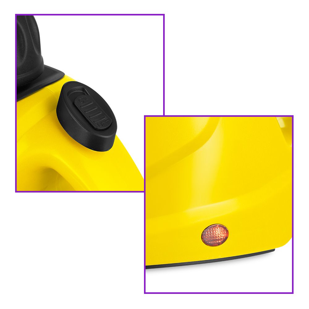 При использовании пароочистителя вы заметите, как индикатор периодически мигает, что указывает на автоматическую терморегуляцию нагрева внутри бойлера. Для подачи пара сдвиньте предохранитель в верхнее положение и удерживайте кнопку подачи пара.