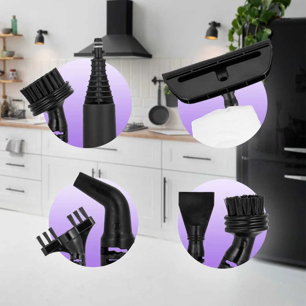 Скребок, нейлоновые щётки очищают стойкие загрязнения. Насадка для отпаривания со скребком используется для отпаривания вещей и чистки окон, зеркал. Также в комплекте идут струйная, угловая насадки, которые помогут очистить щели и углы. Тряпка для пола устанавливается на напольную щётку с помощью липучек. Её можно стирать в стиральной машине в тёплой воде. В комплекте есть рамка для ковра, которая обеспечивает лёгкое скольжение щётки во время чистки.