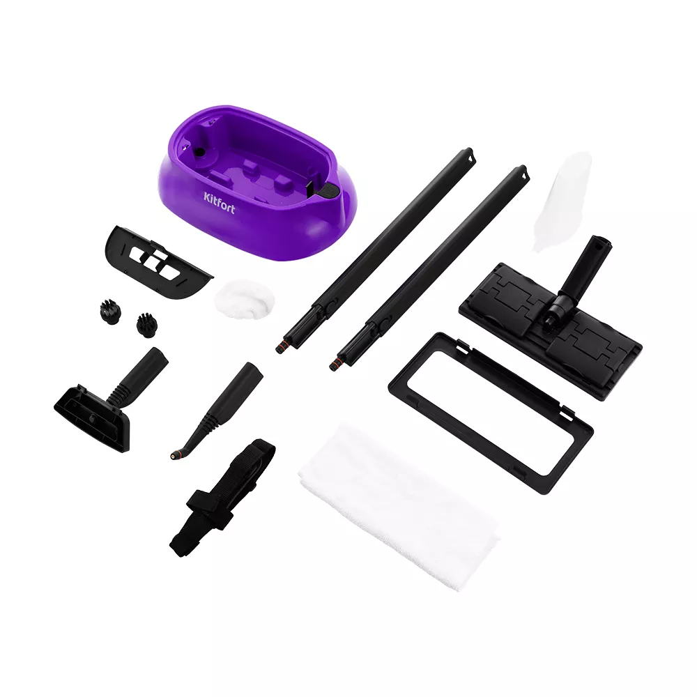 В комплект, помимо различных насадок, входят также щётка для пола, тряпка, рамка для чистки ковров, удлинительные трубки, что делает КТ-9102 максимально универсальным устройством для очистки, глажки, дезинфекции самых разных поверхностей! Чтобы насадки не терялись, в подставке пароочистителя можно хранить все насадки.