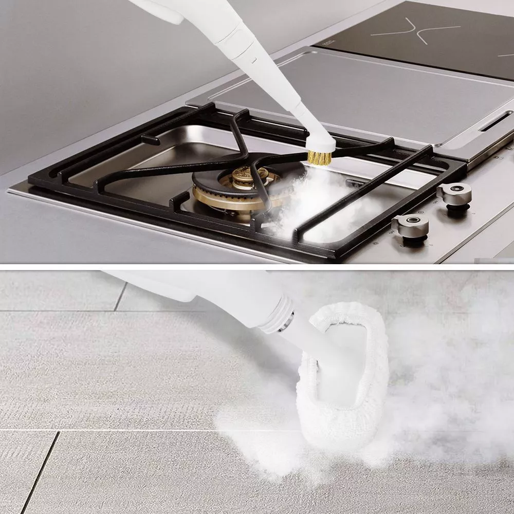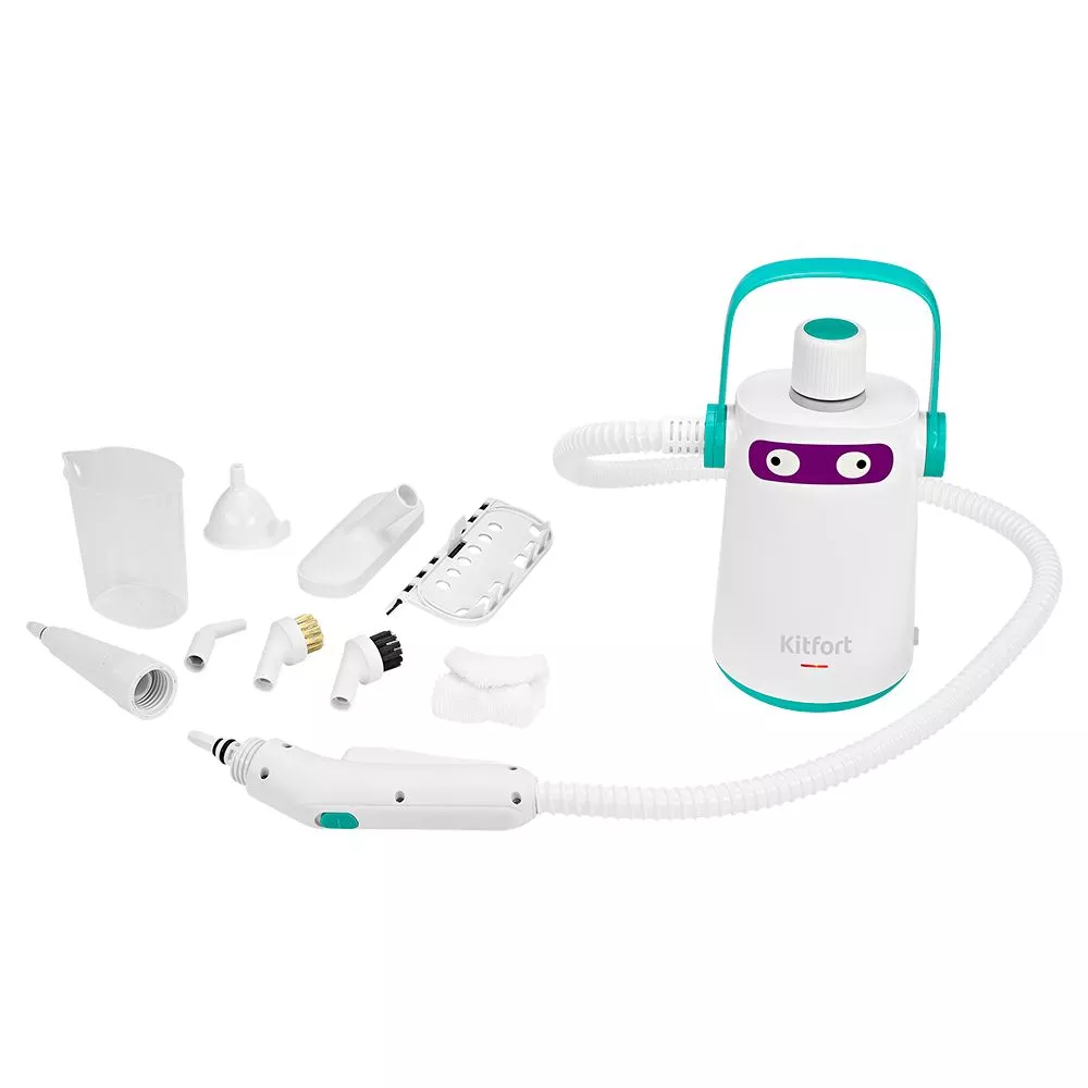 В комплекте с пароочистителем идёт мерный стакан, все необходимые насадки и воронка для удобного добавления воды в бойлер. Ёмкость бойлера составляет 0,3 л.