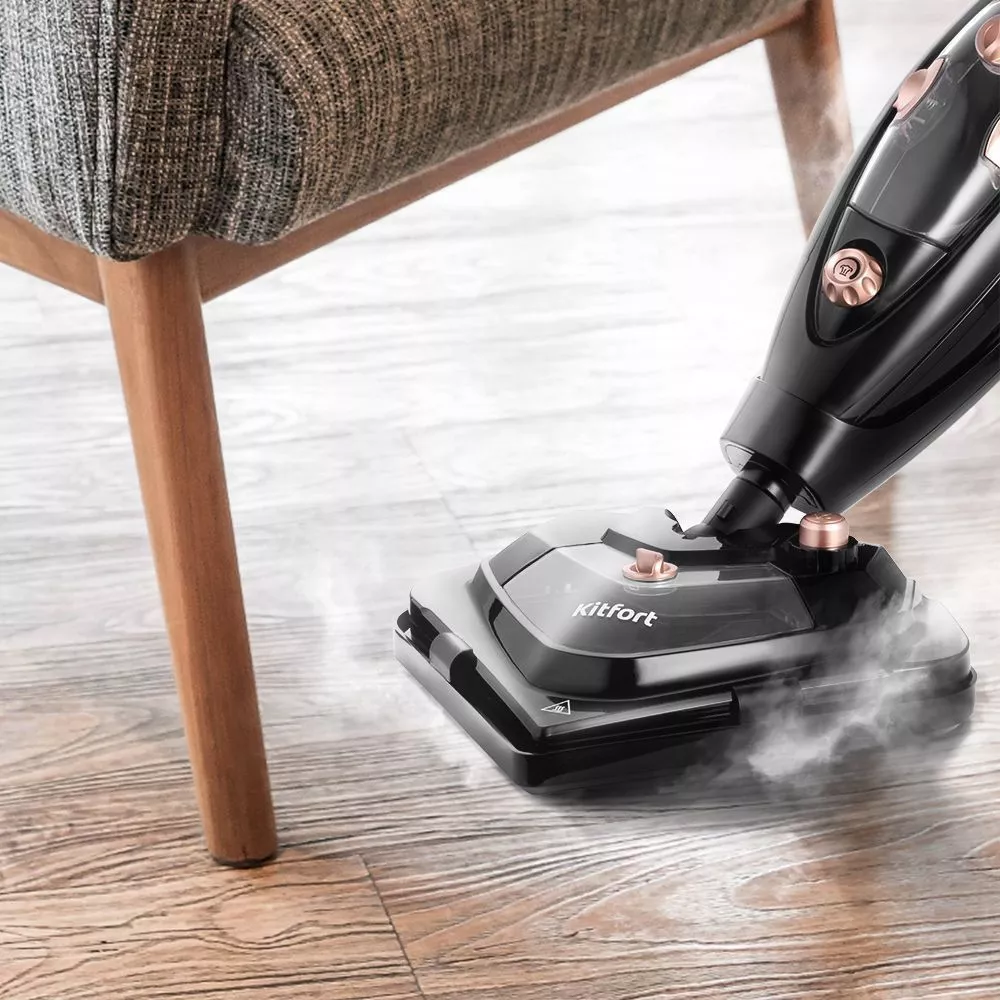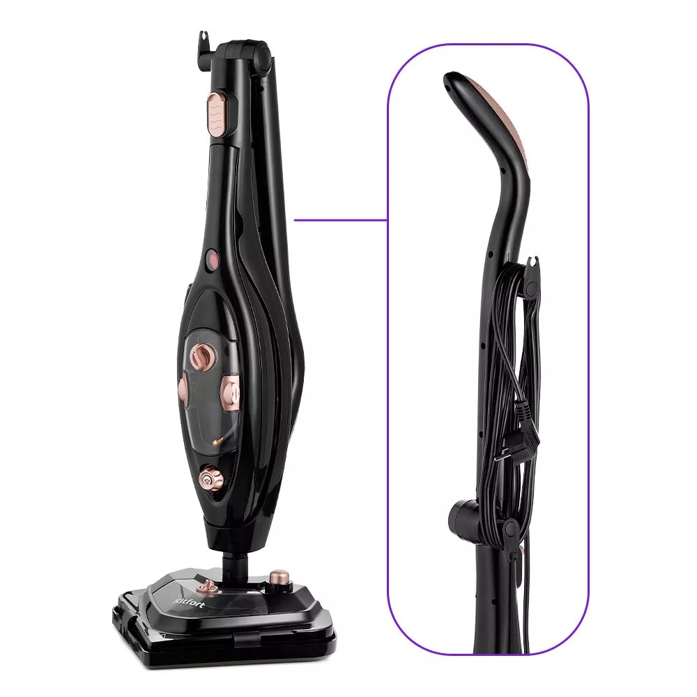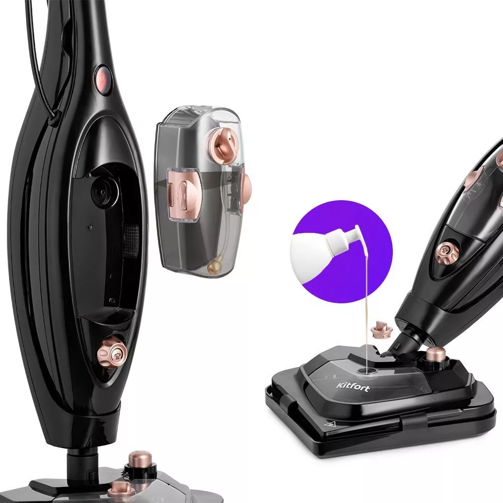 Множество насадок, которые идут в комплекте с паровой шваброй, справятся с труднодоступными местами и сложными поверхностями. Мерный стакан служит для удобного и безопасного наливания воды в резервуар. При хранении швабра не займёт много места. Шнур длиной 4,7 м не сковывает и не ограничивает ваше перемещение во время уборки. Складная ручка корпуса обеспечивает компактное хранение.