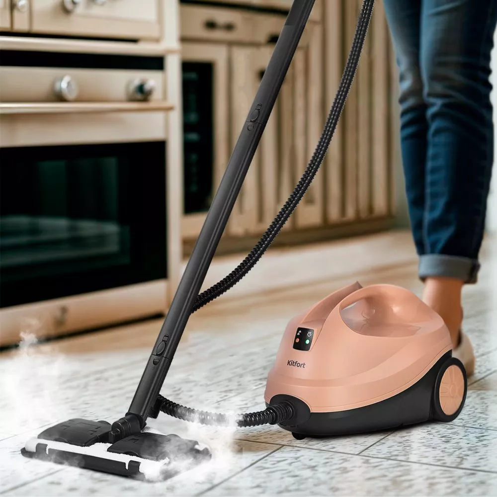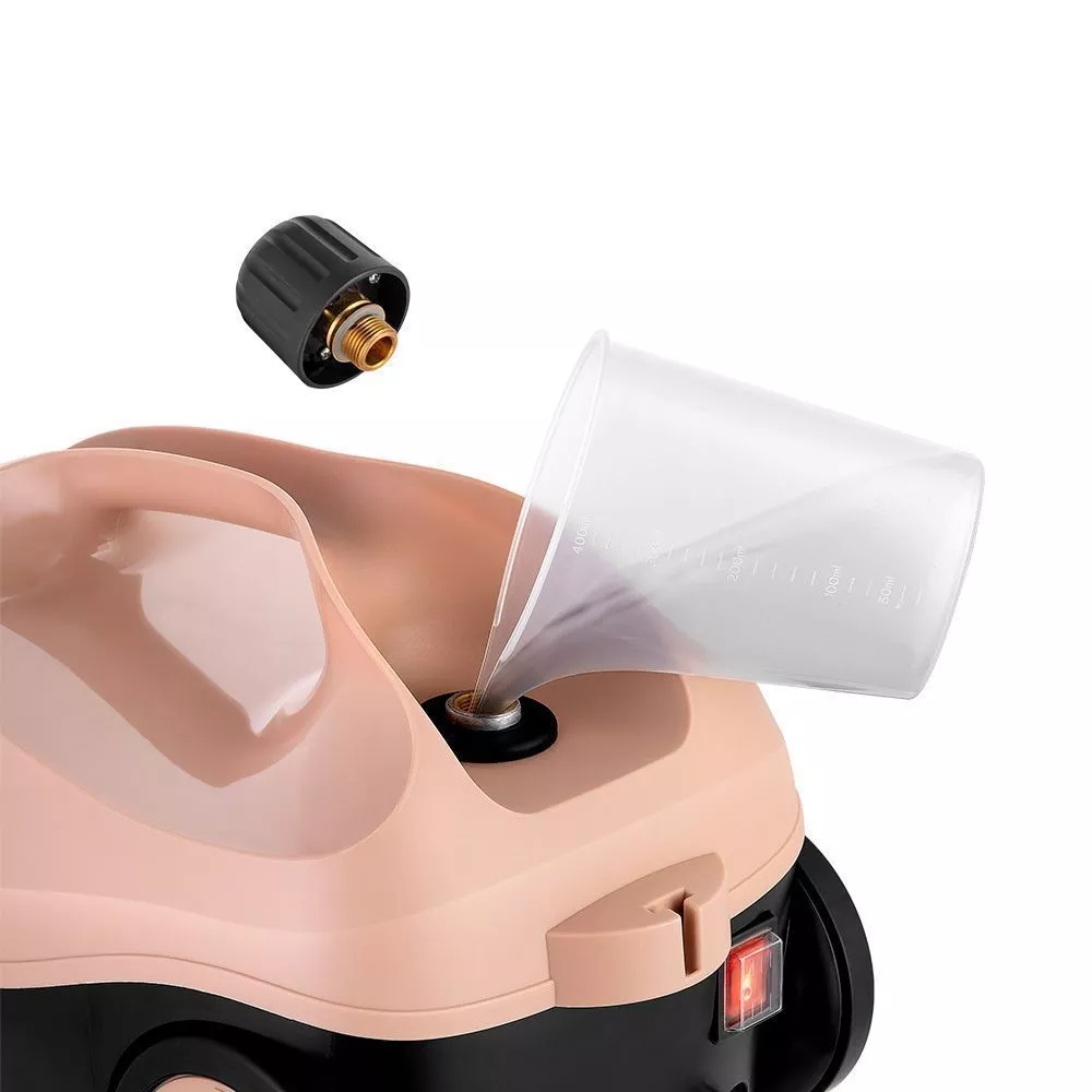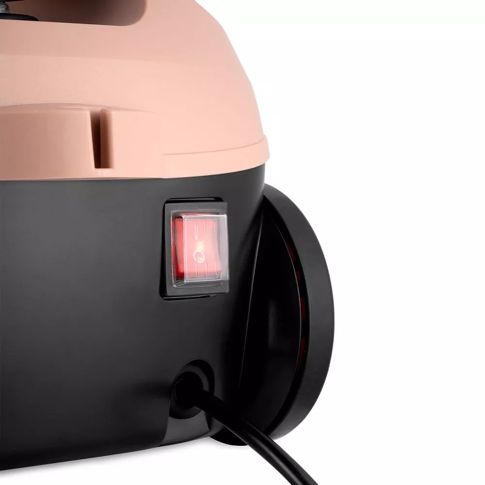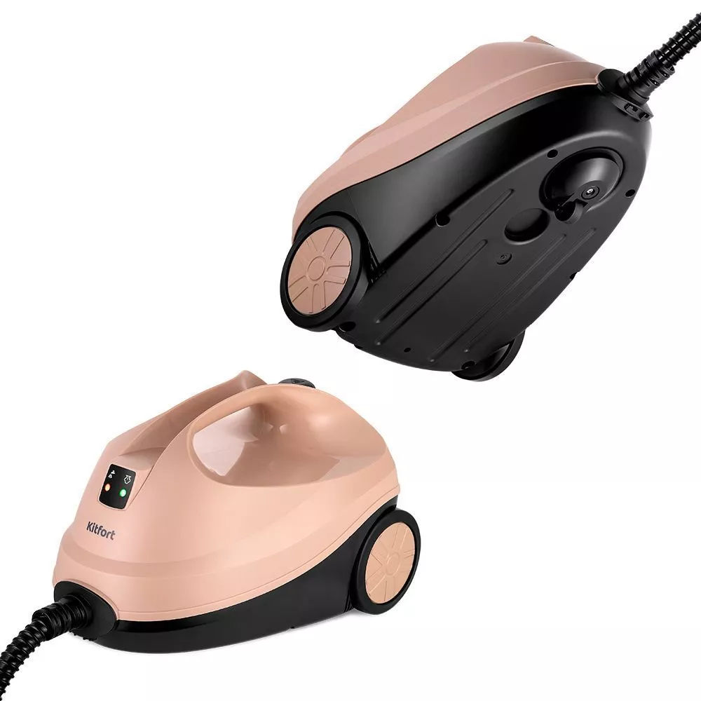 Пароочиститель оснащён ручкой для удобной переноски. Также прибор оснащён колёсиками для транспортировки прибора при необходимости. Длина шнура 2,7 м. Излишки шнура питания вы всегда можете намотать на держатель, который подсоединяется к обратной стороне прибора.