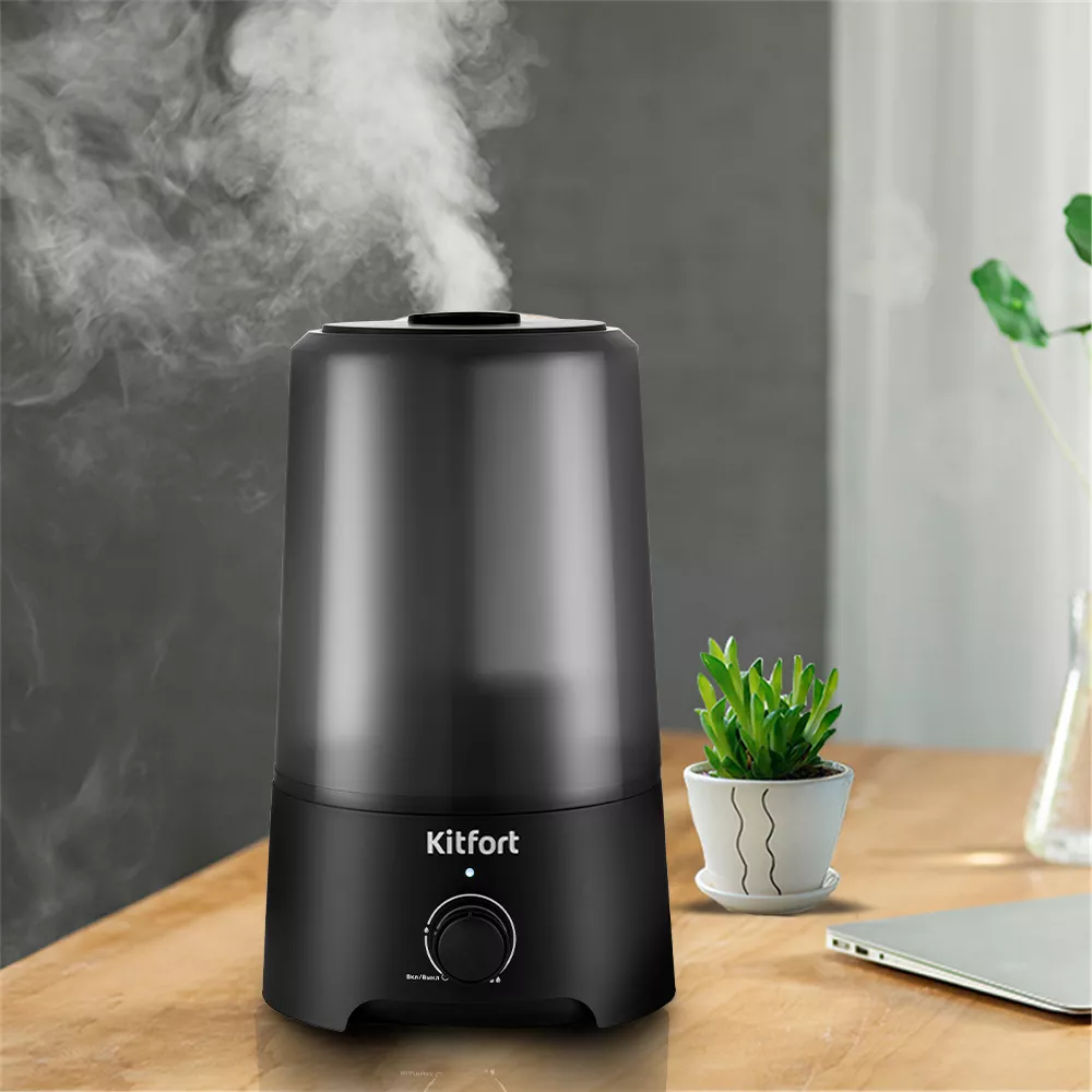 С помощью переключателя вы можете регулировать нужный поток тумана. Увлажнитель оснащён автоматическим переходом в режим ожидания: когда вода в резервуаре закончится, индикатор над переключателем загорится красным, и увлажнитель перейдёт в режим ожидания.