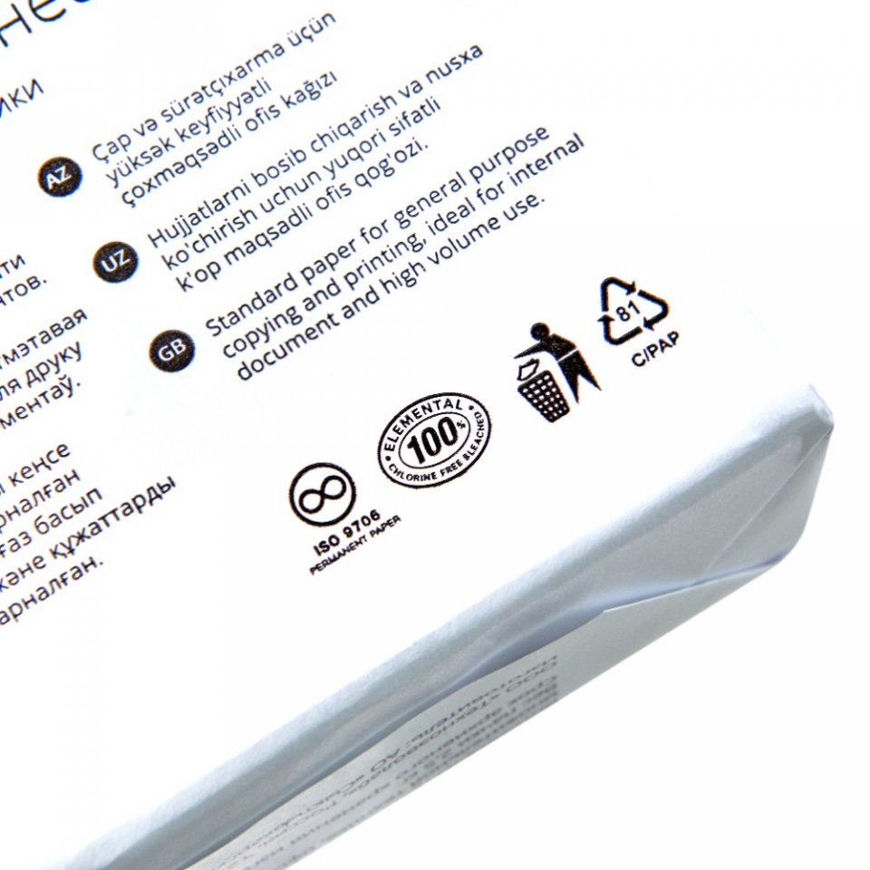 Бумага сертифицирована по ISO 9706-2000 (рекомендована для архивного хранения). Произведена по технологии ECF (отбеливание без использования элементарного хлора).
