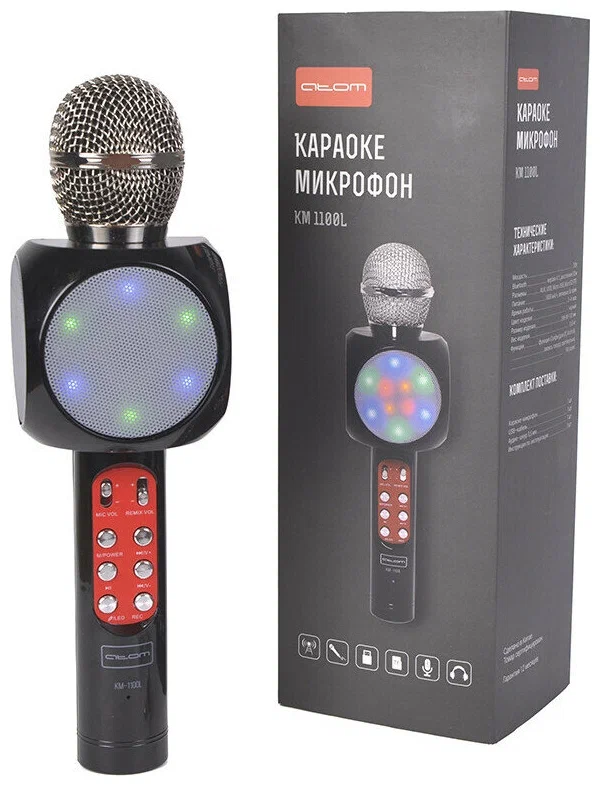 Караоке-микрофон ATOM KM-1100L. «Атом» КМ-1100L – это беспроводной караоке-микрофон, объединяющий в себе функции микрофона и аудио-колонки. Устройство не только принимает звук, но и воспроизводит его. Караоке-микрофон отлично подойдет как для различных мероприятий, так и для домашнего пользования.