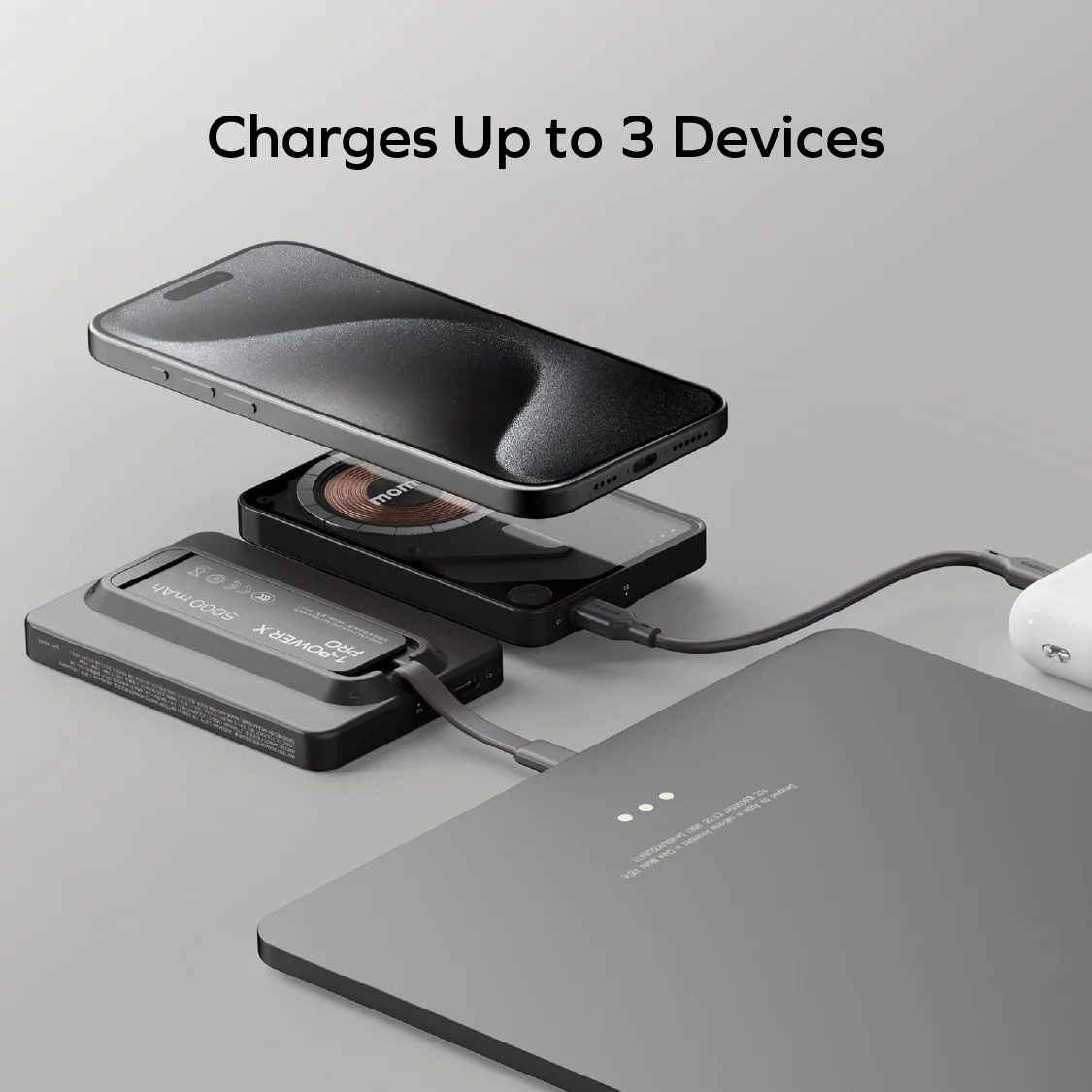 1-Power X Pro позволит вам заряжать до 3-х устройств одновременно! Используйте беспроводную зарядку или USB-C порт с помощью встроенного кабеля, который позволяет заряжать устройства напрямую, избавляя вас от запутанных проводов.