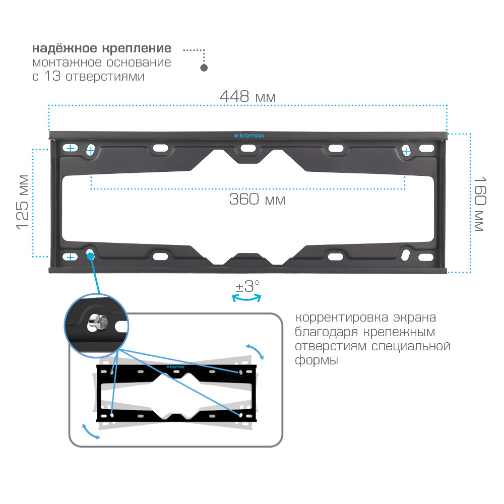 Кронштейн подходит для большинства телевизоров популярных брендов, таких как Samsung, LG, Sony, Panasonic, Sharp, Toshiba, KIVI, Xiaomi Mi, SUPRA, Hyundai, Erisson, Horizont, JVC, Thomson, HAIER, BBK, Витязь, Веко, BQ, OZON, SkyLine, Pioneer, Philips, Rolsen, Harper, Hisense, Hitachi, Polarline, Prestigio и других. Крепёжные отверстия Kromax ELEMENT-4 изготовлены по стандарту VESA.