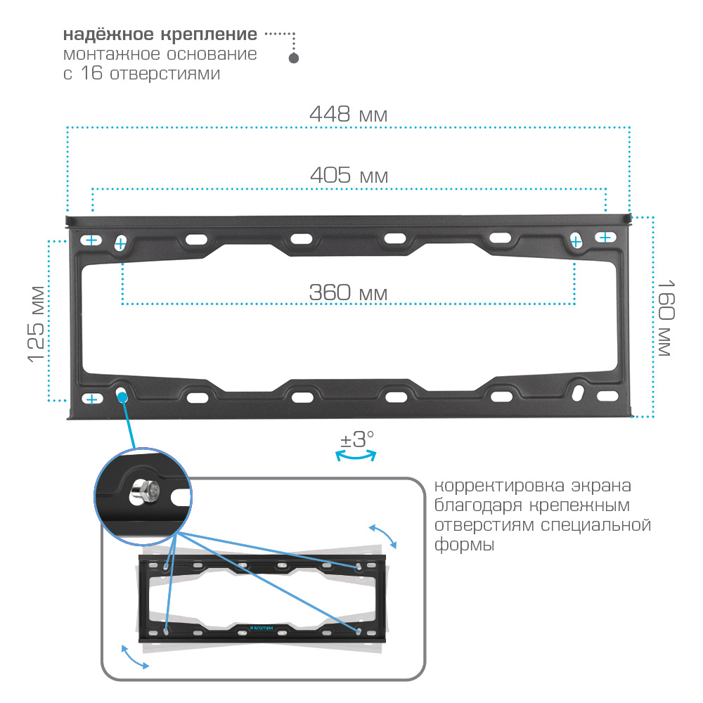 Кронштейн подходит для большинства телевизоров популярных брендов, среди которых Samsung, LG, Sony, Panasonic, Sharp, Toshiba, KIVI, Xiaomi Mi, SUPRA, Hyundai, Erisson, Tcl, Asano, Horizont, JVC, Thomson, HARTENS, Skyworth, HAIER, BBK, AVEL, Витязь, Веко, BQ, DEXP, OZON, SkyLine, Pioneer, Philips, Rolsen, Harper, Hisense, Hitachi, Polarline, Prestigio и других. Крепёжные отверстия кронштейна изготовлены по международному универсальному стандарту VESA.