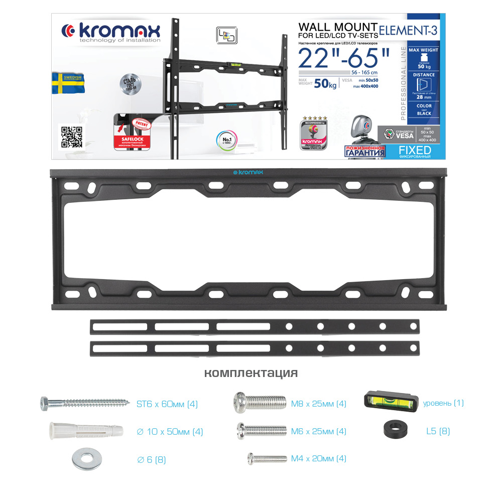 Комплектация Кронштейн для телевизора, комплект крепежа для установки ТВ, навесной уровень, подробная инструкция на русском языке