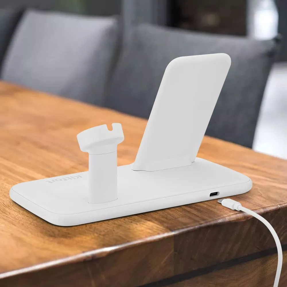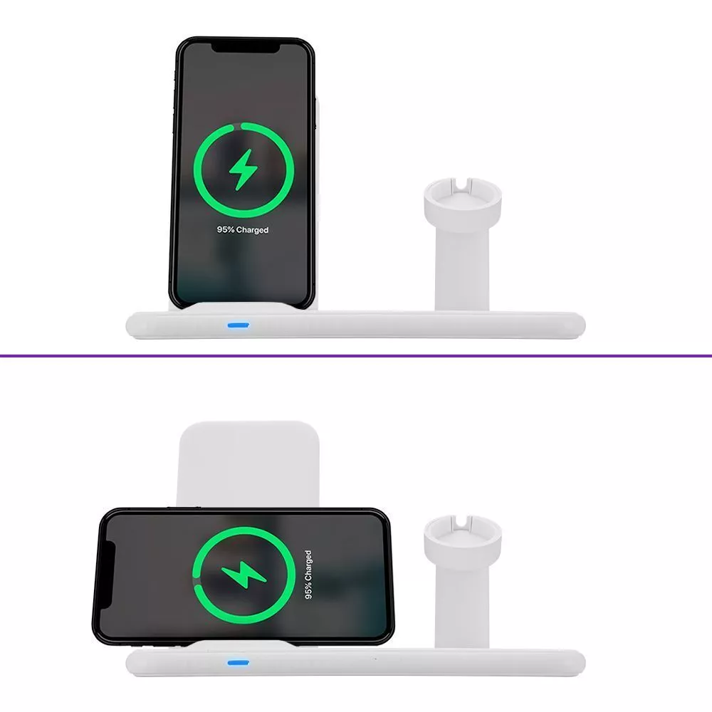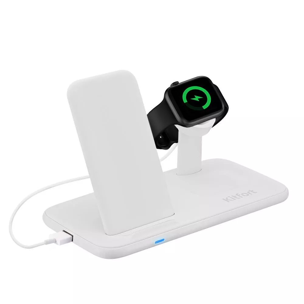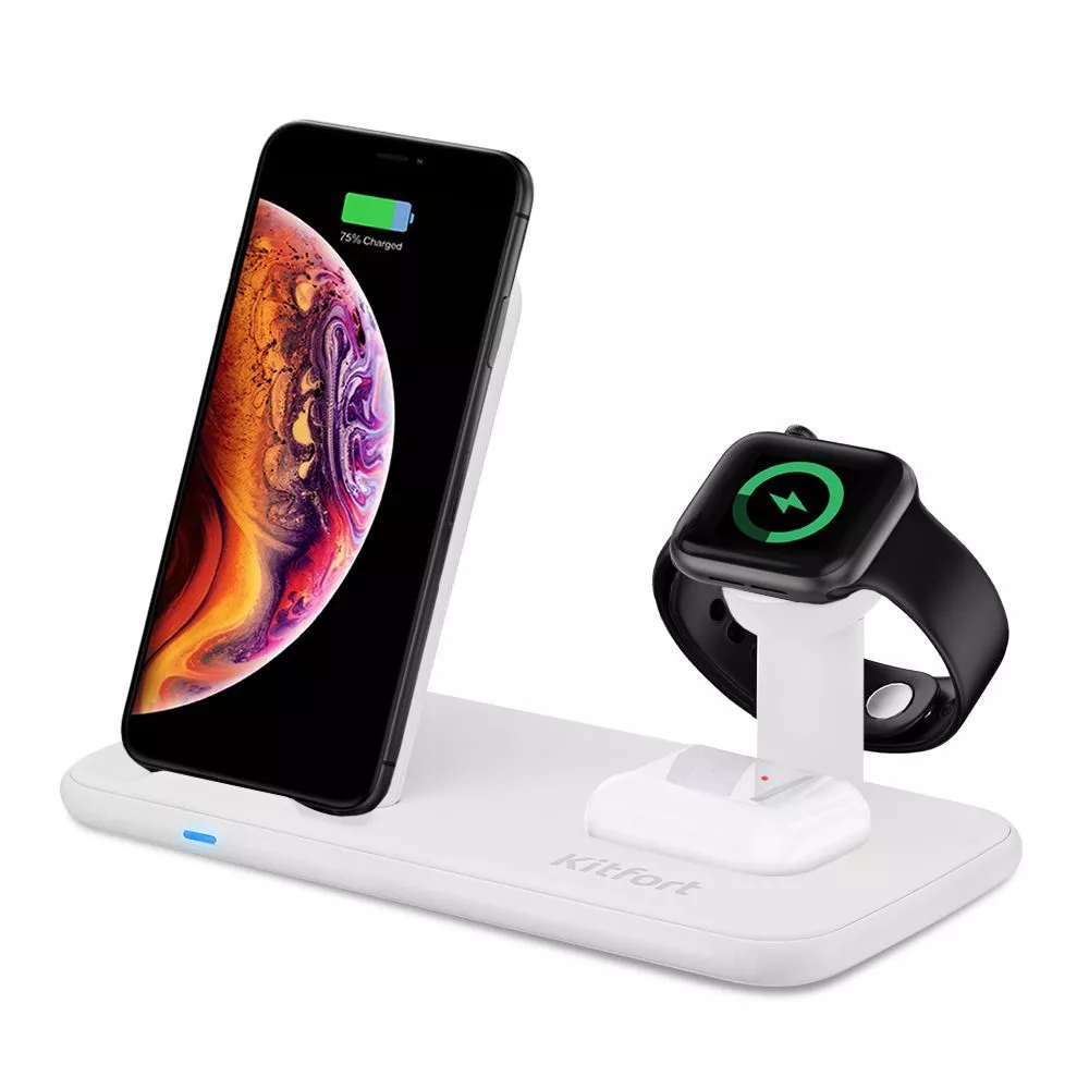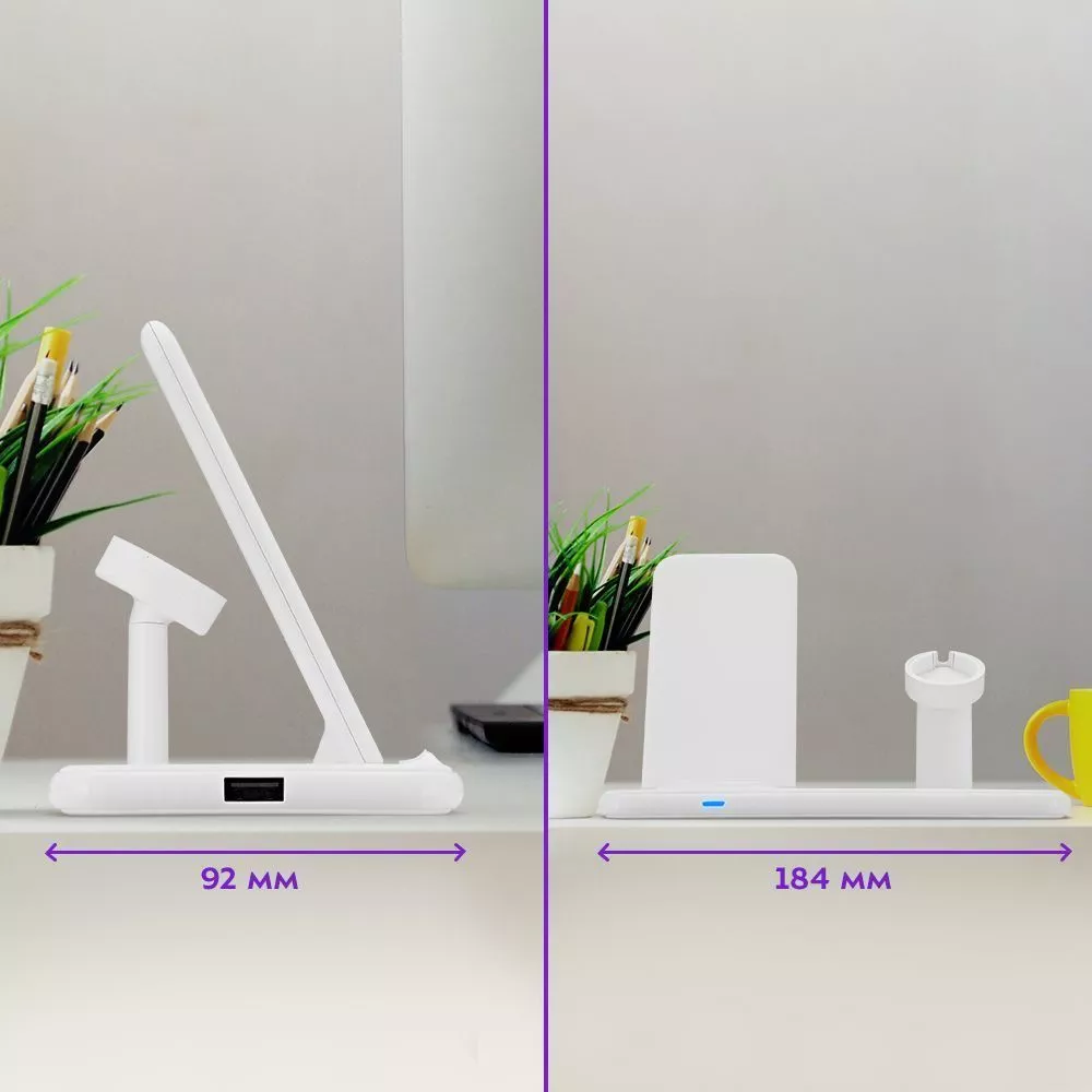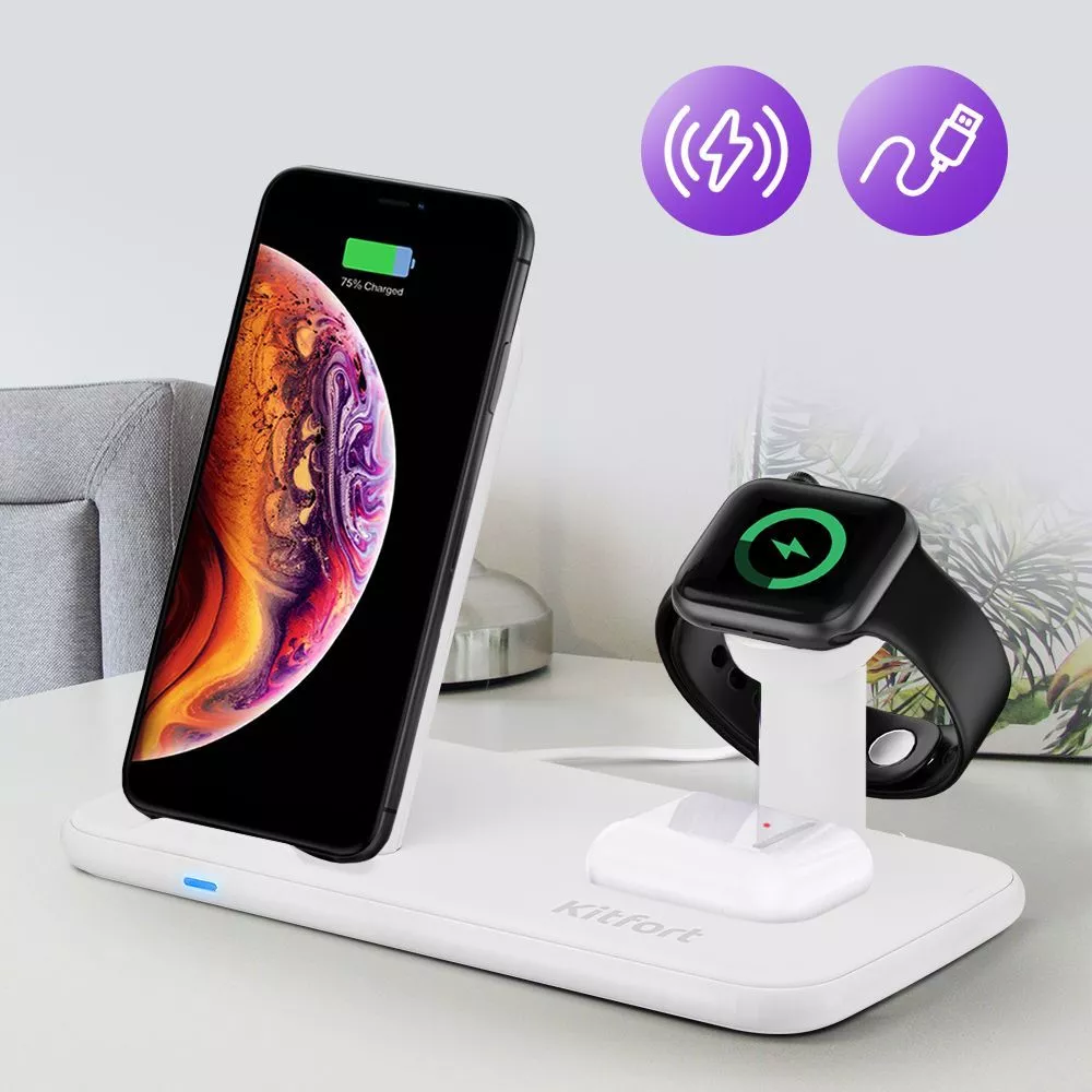 У зарядной станции есть подставка для телефона, где можно расположить смартфон как в вертикальном, так и в горизонтальном положении. Это очень удобно при использовании разных приложений или просмотре видео, если при этом телефон необходимо зарядить. Подставка для часов не имеет беспроводной зарядки, поэтому для зарядки часов оригинальную зарядку устанавливают на подставку, подключают её к USB-порту зарядной станции, а затем на подставку для часов с зарядкой кладут часы.