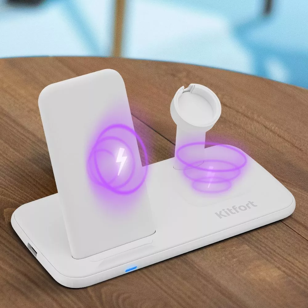 Зарядная станция подключается к источнику питания при помощи шнура USB Type-C. У зарядной станции есть индикатор на передней панели: при подключении к источнику питания индикатор горит зелёным. Благодаря стильному дизайну и компактному размеру зарядная станция легко впишется в ваш интерьер.