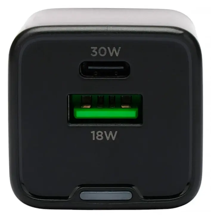 Устройство оснащено двумя разъемами: USB Type-A и USB Type-C, что позволяет одновременно заряжать несколько гаджетов. Максимальная выходная мощность USB-C достигает 30 Вт, что идеально подходит для быстрой зарядки современных смартфонов и планшетов.