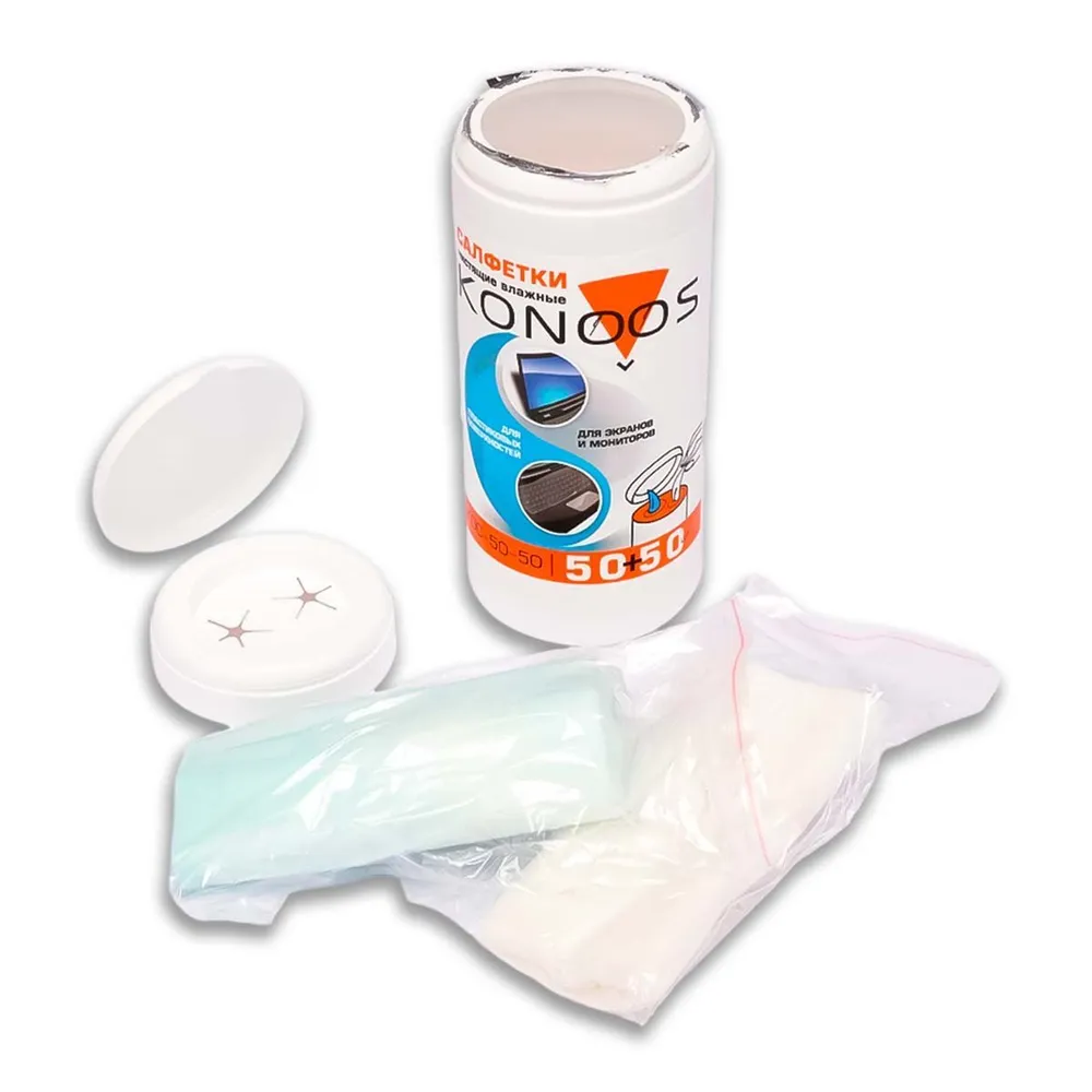 В комплект входит 50 салфеток белого цвета для очистки экранов, а так же 50 салфеток синего цвета для очистки пластика.